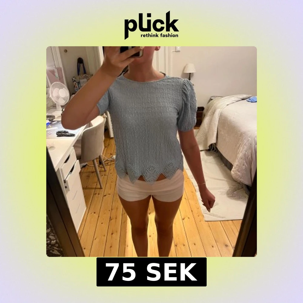 Supersöt ljusblå blus från Zara med kort puffärm och vågig struktur. Nederkanten har unika spetsdetaljer i form av virkade rutor och samma detalj finns på ärmarna. Perfekt för dig som gillar romantisk och trendig stil.
