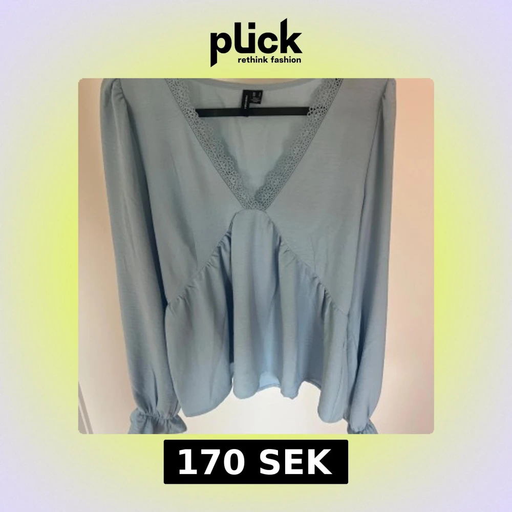 Säljer en ljusblå blus från veromoda med v-ringning och spetsdetalj längs urringningen. Blusen har långa ärmar med resår vid ärmslut och en lös passform som ger ett luftigt intryck. Använd ett fåtal gånger! Storlek S🤍