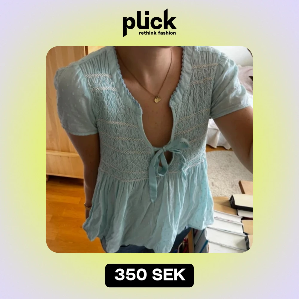 Säljer en söt ljusblå blus med korta ärmar och fina spetsdetaljer. Blusen har en knytning framtill och ett smockat parti som ger en romantisk känsla. Perfekt för vår och sommar!