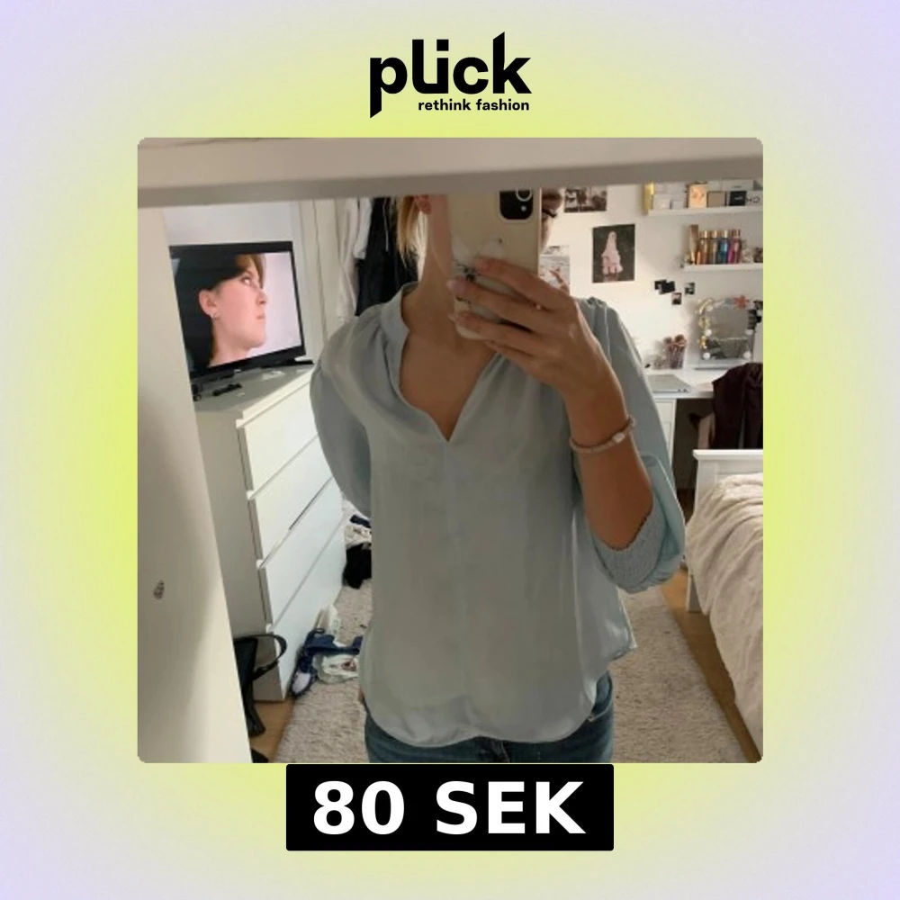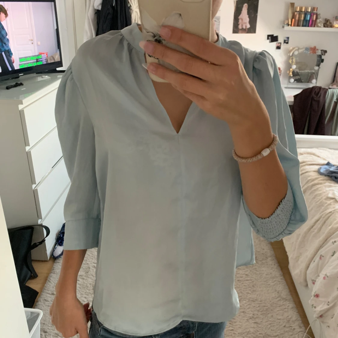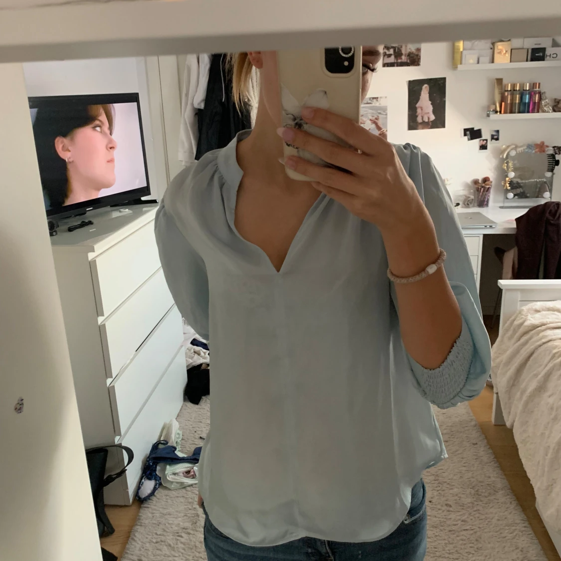 Säljer en ljusblå blus med v-ringning och trekvartsärmar. Blusen har lätt puffade axlar och smockdetalj vid ärmsluten. Den är luftig och har en avslappnad passform, perfekt till jeans eller kjol.