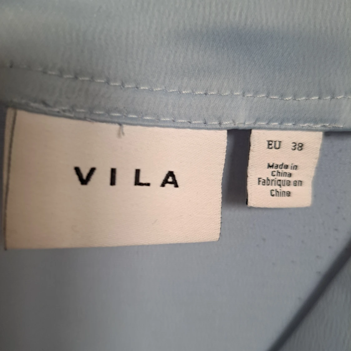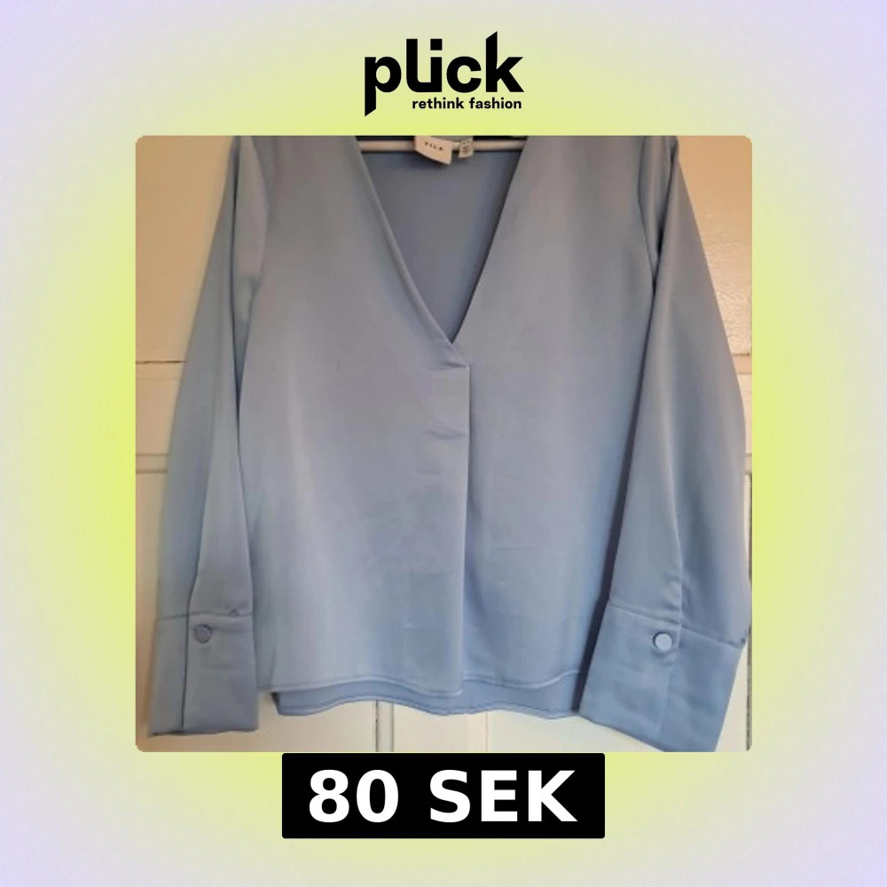 Supersnygg ljusblå blus från Vila med djup v-ringning och långa ärmar. Blusen har breda manschetter med knappdetalj och en rak, lite lös passform. Perfekt att styla med jeans eller kjol för en fräsch look.