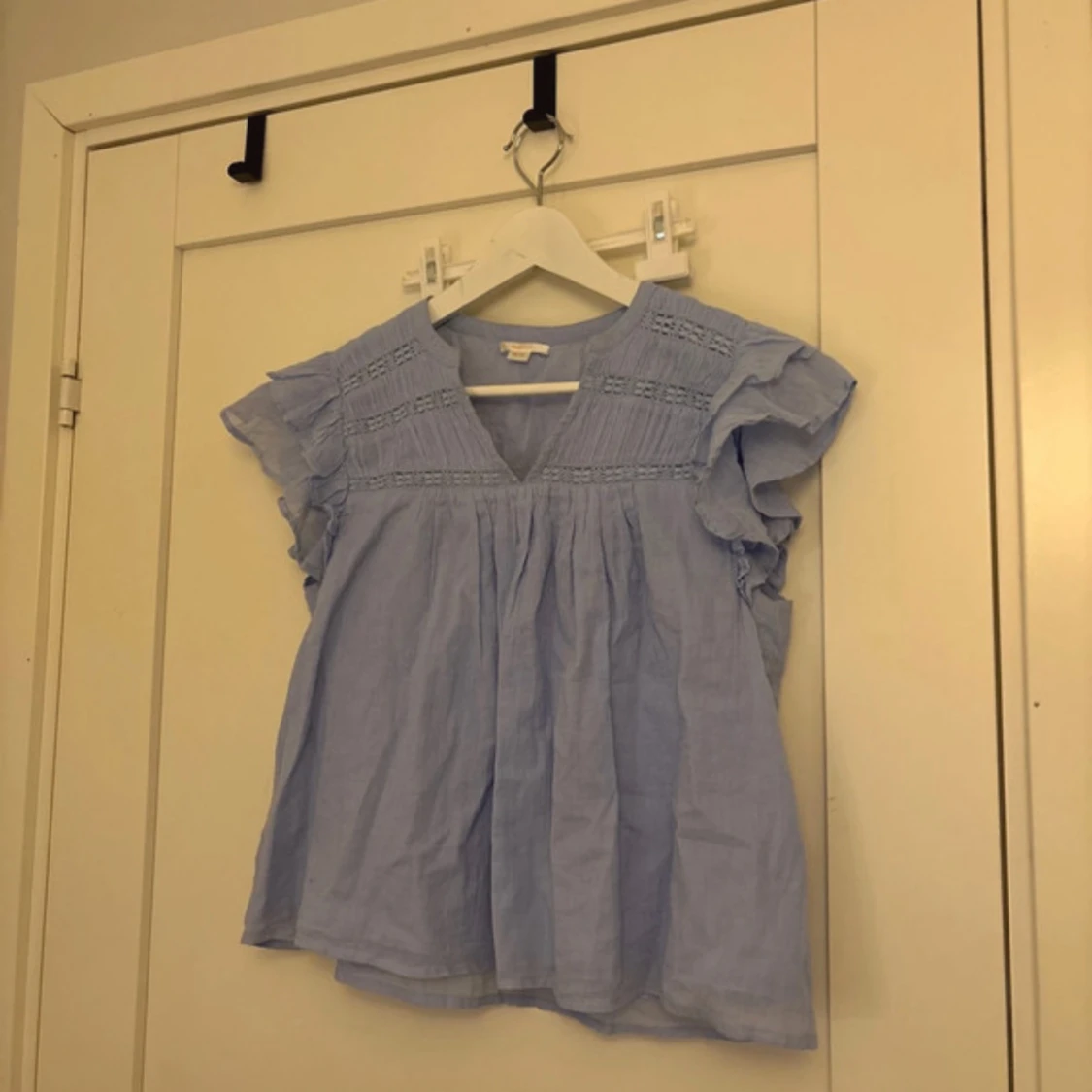 Charmig ljusblå blus med v-ringning och volangdetaljer på ärmarna. Perfekt för en somrig look med sin luftiga design och fina detaljer.
