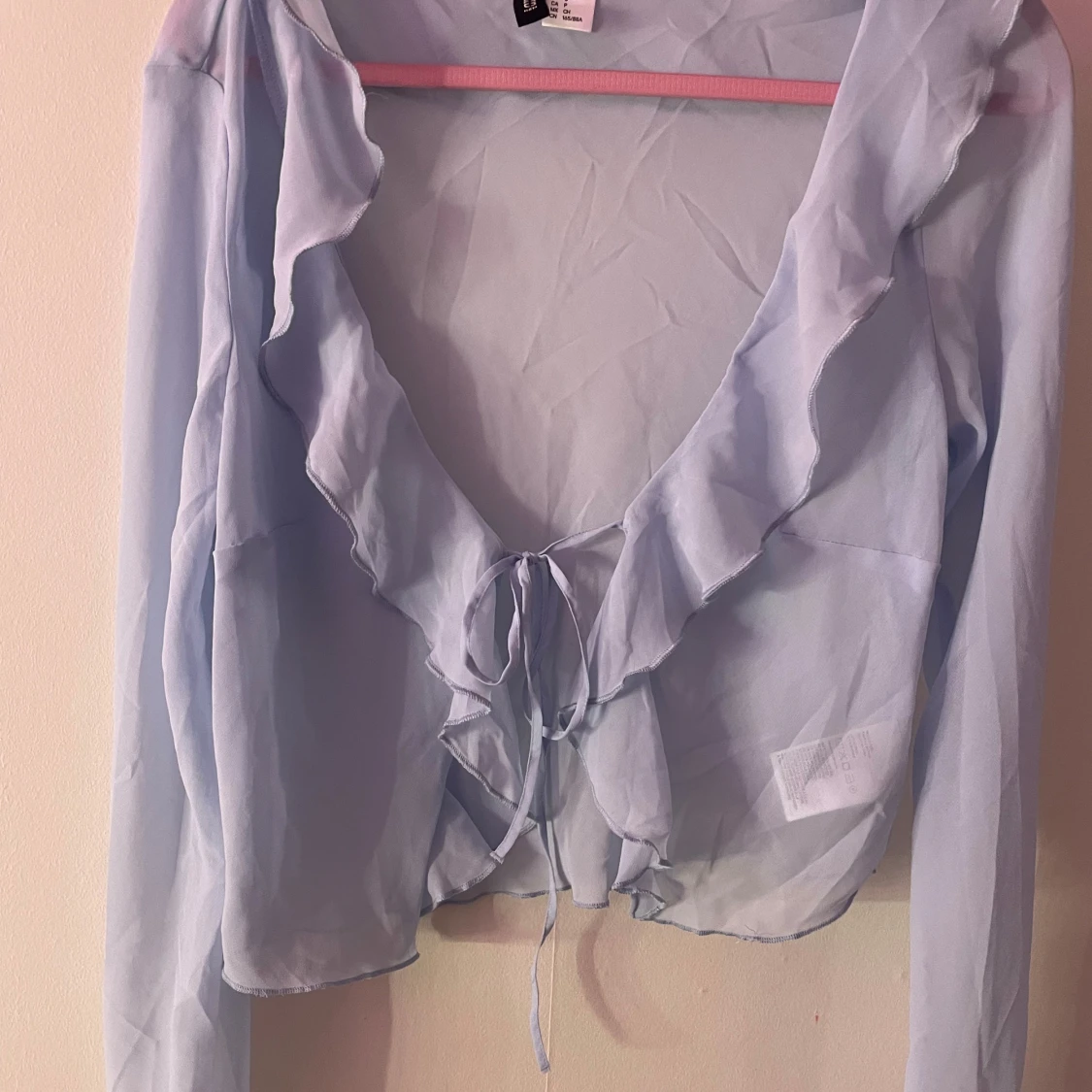 Säljer en ljusblå blus med volangdetaljer och knytning framtill. Blusen har långa ärmar och en luftig passform, perfekt för vår och sommar. Den är tillverkad i ett lätt och skönt material.