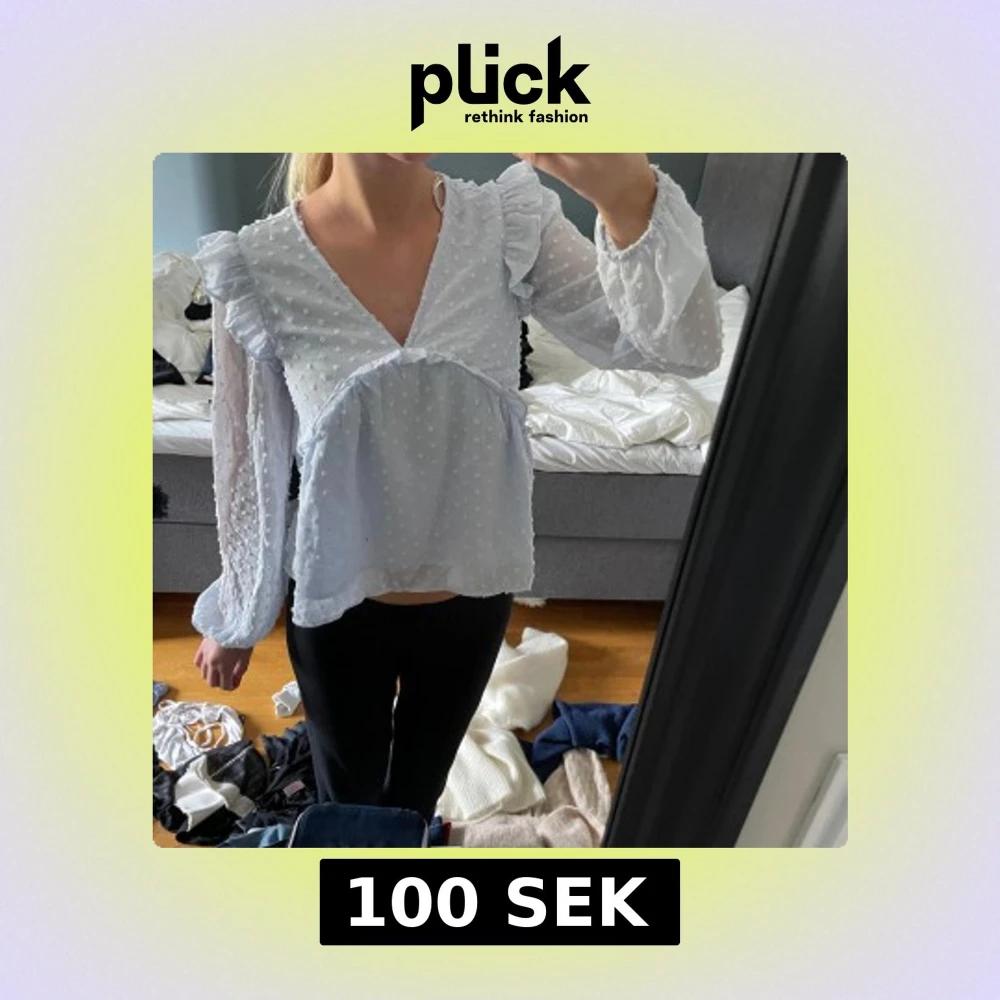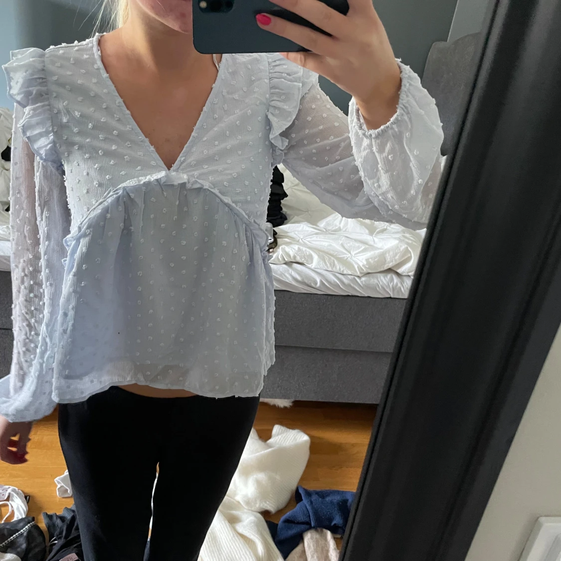 Säljer en ljusblå blus med transparenta långärmar och små prickar i tyget. Blusen har v-ringning, volangdetaljer vid axlarna och en luftig, flowy passform. Perfekt för dig som gillar romantiska och söta detaljer i din stil.