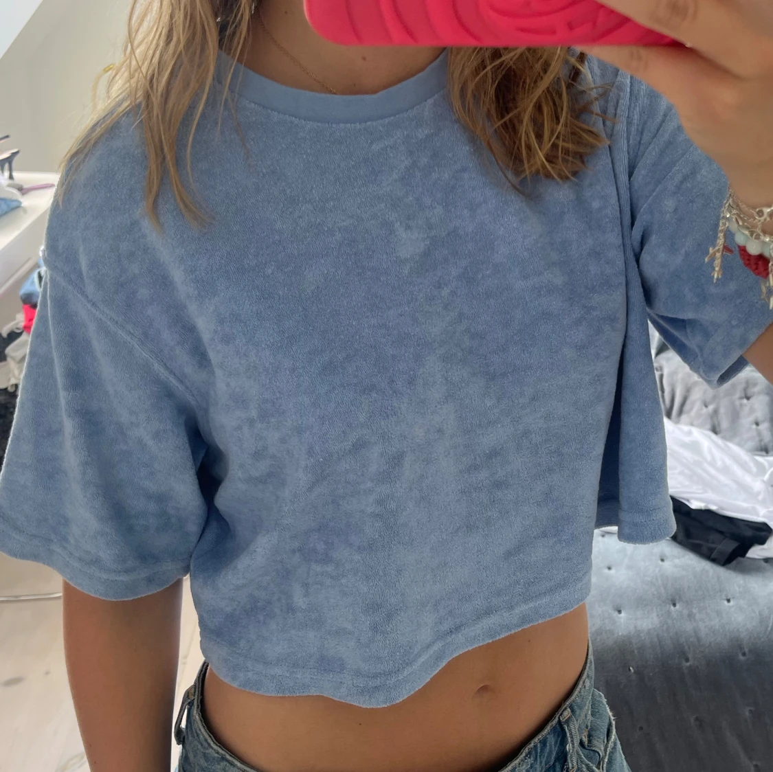 Supermjuk och chill ljusblå croppad topp i frotté med rund hals och korta ärmar. Perfekt till jeans eller shorts för en avslappnad loooook❤️🙏