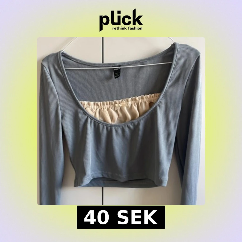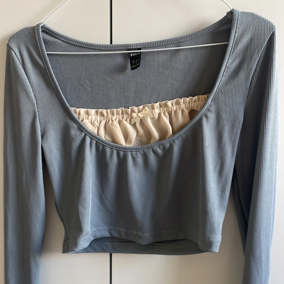Trendig ljusblå croppad topp från SHEIN med lång ärm och ribbad struktur. Toppen har en bred, rundad urringning och en beige detalj framtill som ger en unik look.