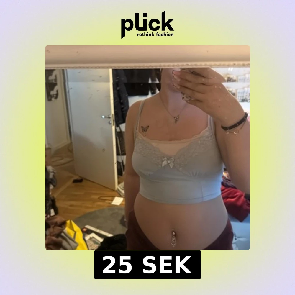 Säljer en ljusblå croppad linnetopp från SHEIN med spetsdetaljer och liten rosett framtill. Toppen har smala axelband och är perfekt för varma dagar. Söt och feminin stil med fina detaljer upptill.