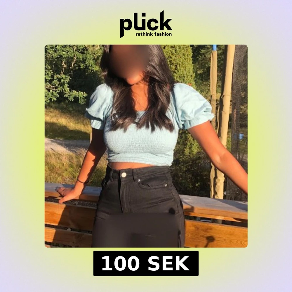 Använd en gång, liten fläck som knappt syns (sista bilden). Supersöt ljusblå croppad topp från Bik Bok med puffiga korta ärmar och smockad, ribbad kropp. Toppen har en fyrkantig halsringning.