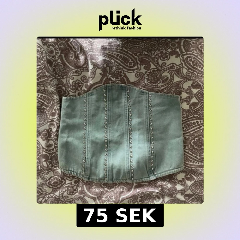 Säljer en ljusblå denim korsett från Boohoo med silverfärgade nitar i vertikala rader framtill. Toppen har en snygg formad överkant och dragkedja bak för enkel påklädning. Perfekt för att ge din outfit en edgy vibe.