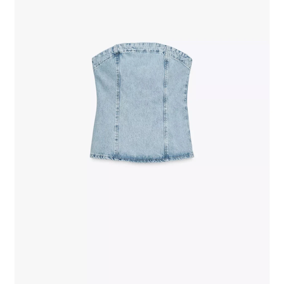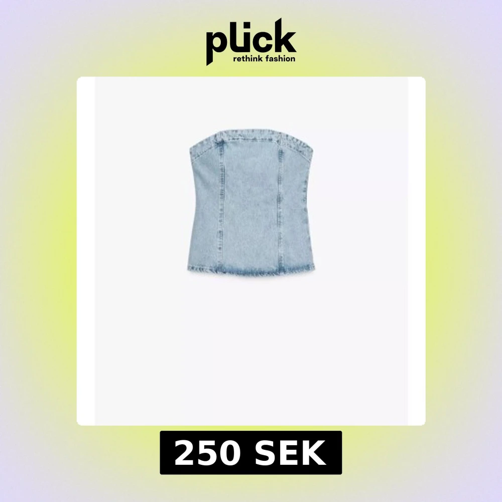 Trendig ljusblå korsett-topp i jeans med råa kanter och figurnära passform. Perfekt att styla med byxor eller kjol för en cool look. Axelbandslös design som ger en snygg siluett.