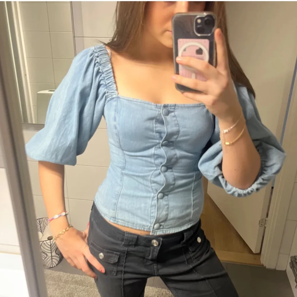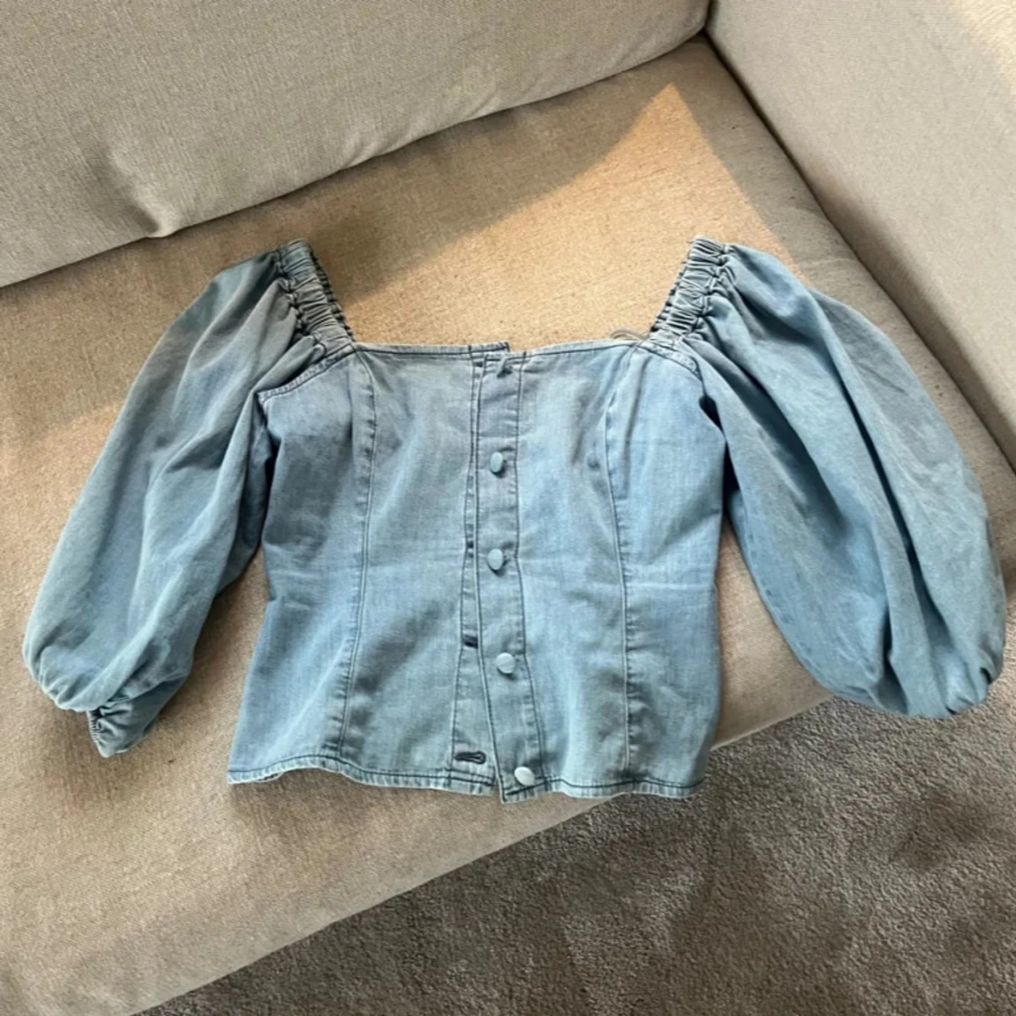 Trendig ljusblå korsettopp i jeanstyg med markerad midja och stora puffärmar. Toppen har fyrkantig urringning och knappar framtill som ger en snygg detalj. Perfekt för dig som vill sticka ut med en cool och feminin look.