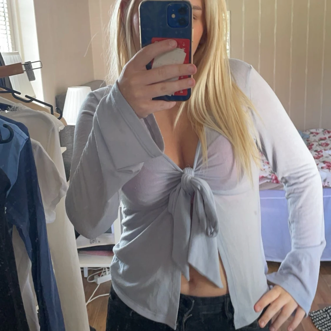Passar mig som är S/M! Säljer en superfin ljusblå blus med knyt framtill. Den har långa ärmar och en v-ringad design som ger en elegant touch. Perfekt för både vardag och fest! 💙från ginatricot!