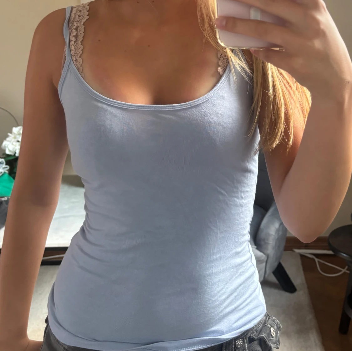 Säljer en ljusblå ribbad linnetopp med smala axelband och rundad halsringning. Toppen är figurnära och har en enkel, stilren design som passar perfekt till jeans eller shorts. Superenkel att matcha och riktigt skön att bära under varma dagar.