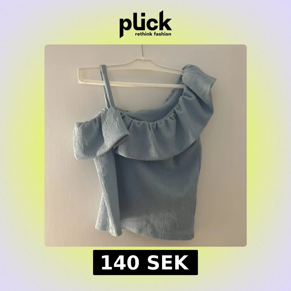Superfin ljusblå topp i ribbad manchester med en axelbandslös design och bred volang runt halsen. Toppen har en axelrem och en ärm, vilket ger en cool oneshoulder-look. Perfekt för dig som vill sticka ut med en trendig och unik stil.