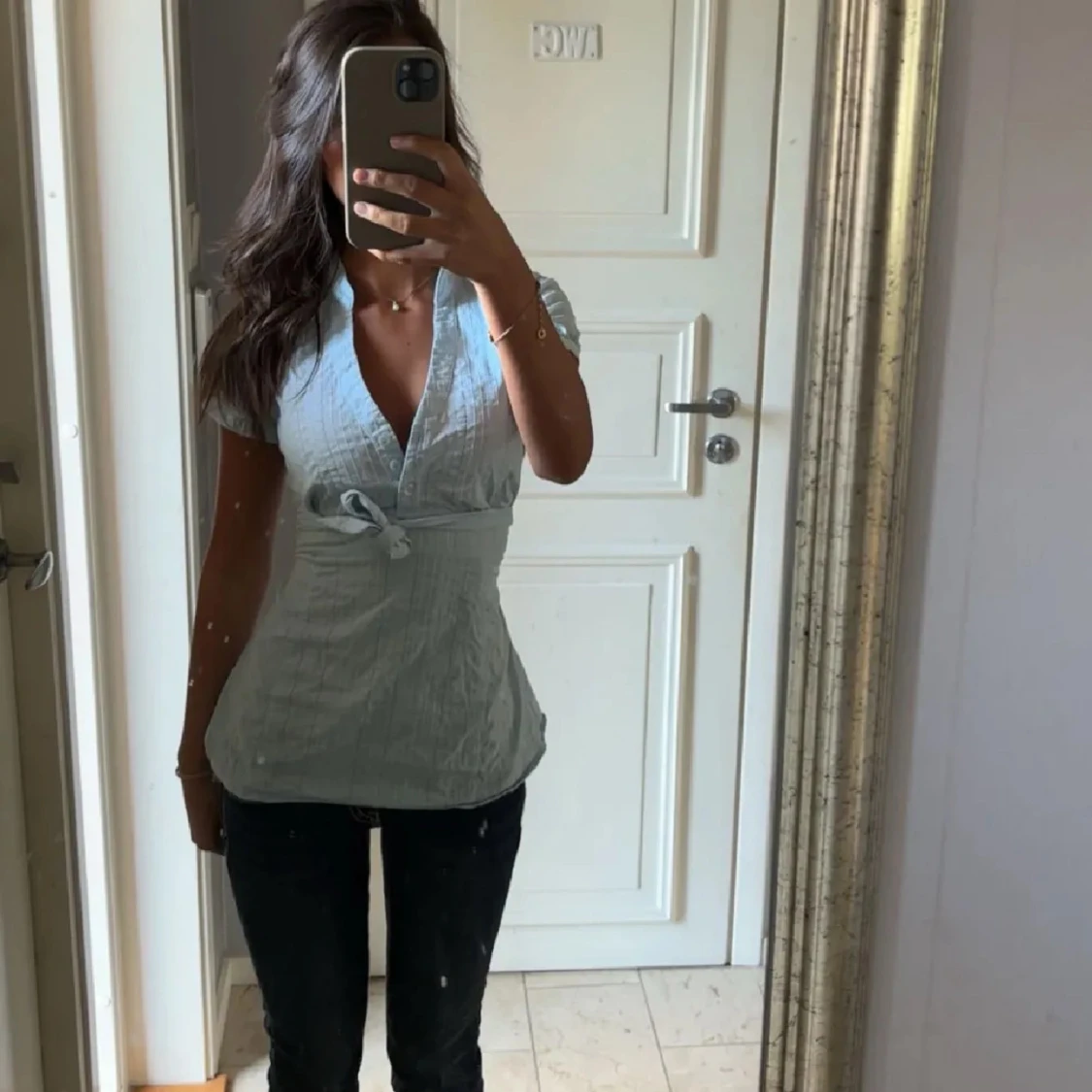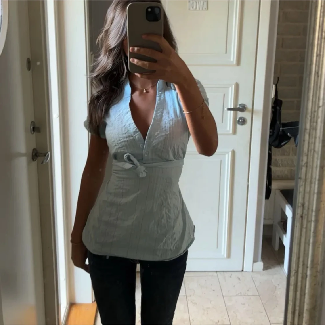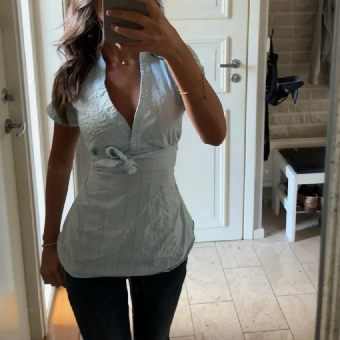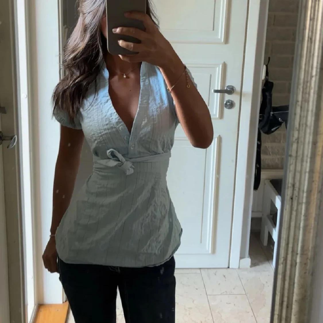 Säljer en ljusblå blus med korta ärmar och v-ringning. Toppen har knappar framtill och ett snyggt knyt i midjan som framhäver figuren. Materialet är lätt och ser ut att vara bomull, perfekt för vår och sommar.