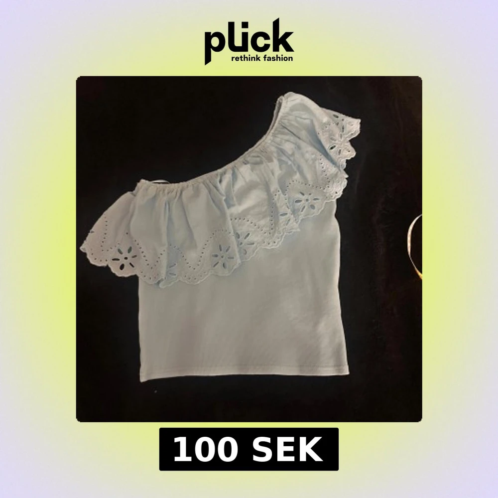 Supersöt ljusblå topp från Zara med oneshoulder-design och bred volang med broderade blommor. Toppen är ärmlös och har en mjuk, ribbad känsla i materialet. Största storleken på barn men skulle säga passar xs/s. Osäker på priset så det kan definitivt diskuteras!!🥰