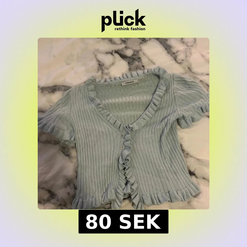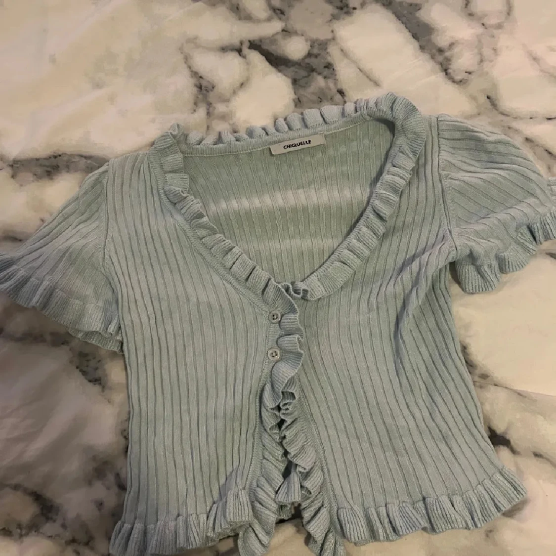 Superfin ljusblå blus från Chiquelle med ribbad struktur och volangdetaljer längs v-ringningen, ärmslut och nederkant. Kortärmad och med knappar framtill, perfekt för en söt och trendig look. Passar dig som gillar romantiska vibes och pastellfärger.
