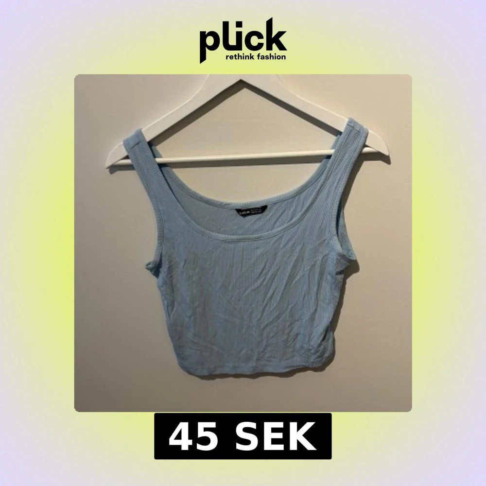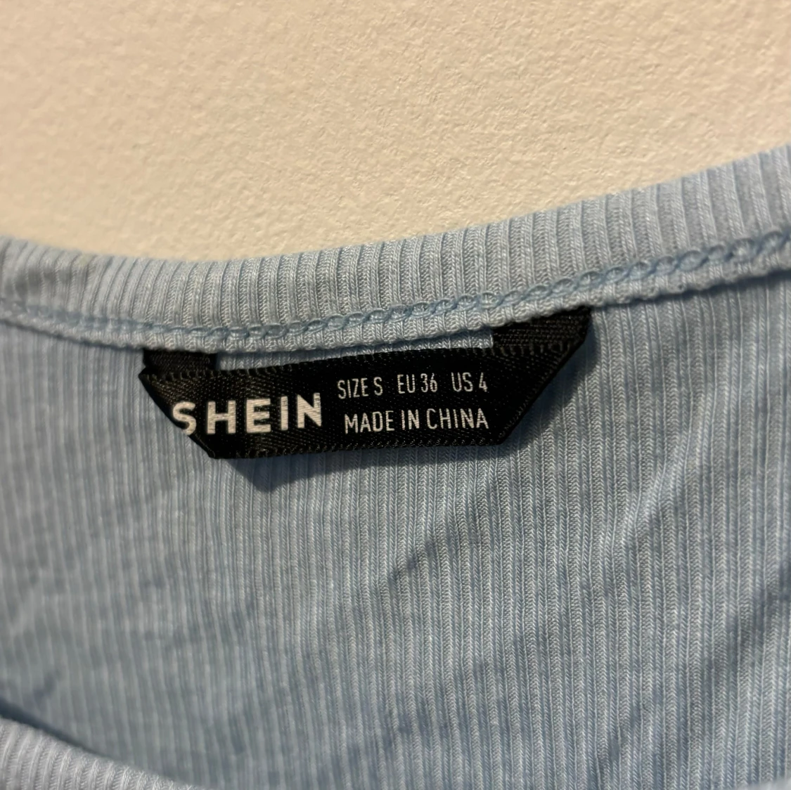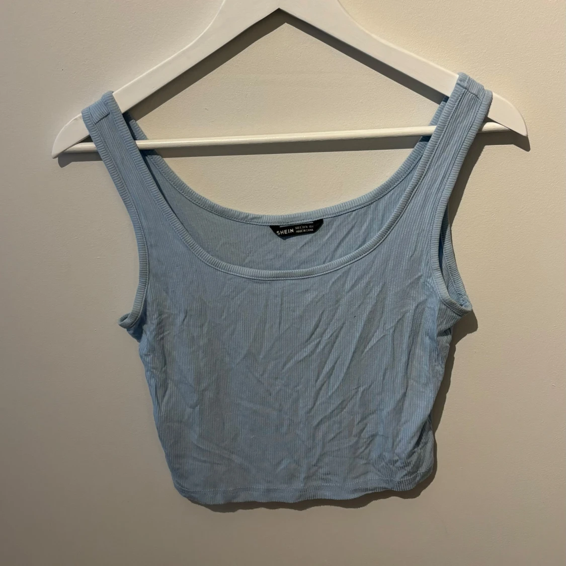 Säljer en ljusblå ribbad linnetopp från Shein. Toppen har breda axelband och en rundad halsringning. Perfekt för varma dagar eller som ett lager under en jacka.