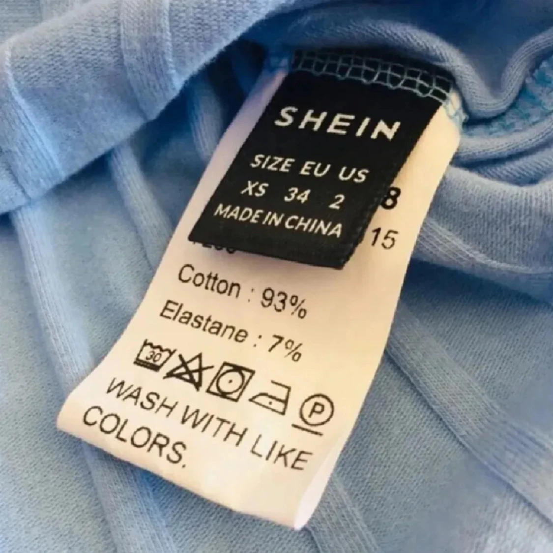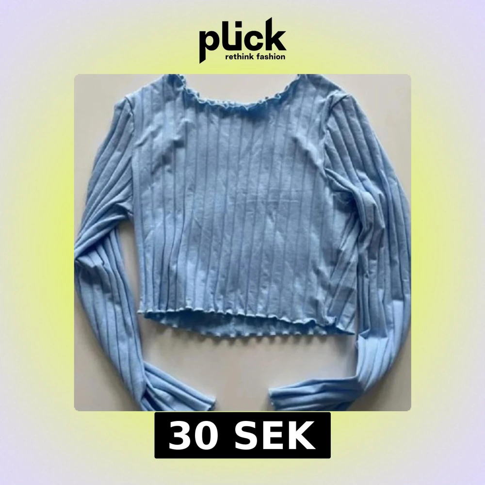 Säljer en ljusblå långärmad topp från SHEIN i storlek XS. Toppen är ribbad med smalrandigt mönster och har en croppad passform med vågig kant vid hals och nederdel. Materialet är mjuk bomull med lite stretch för extra komfort.