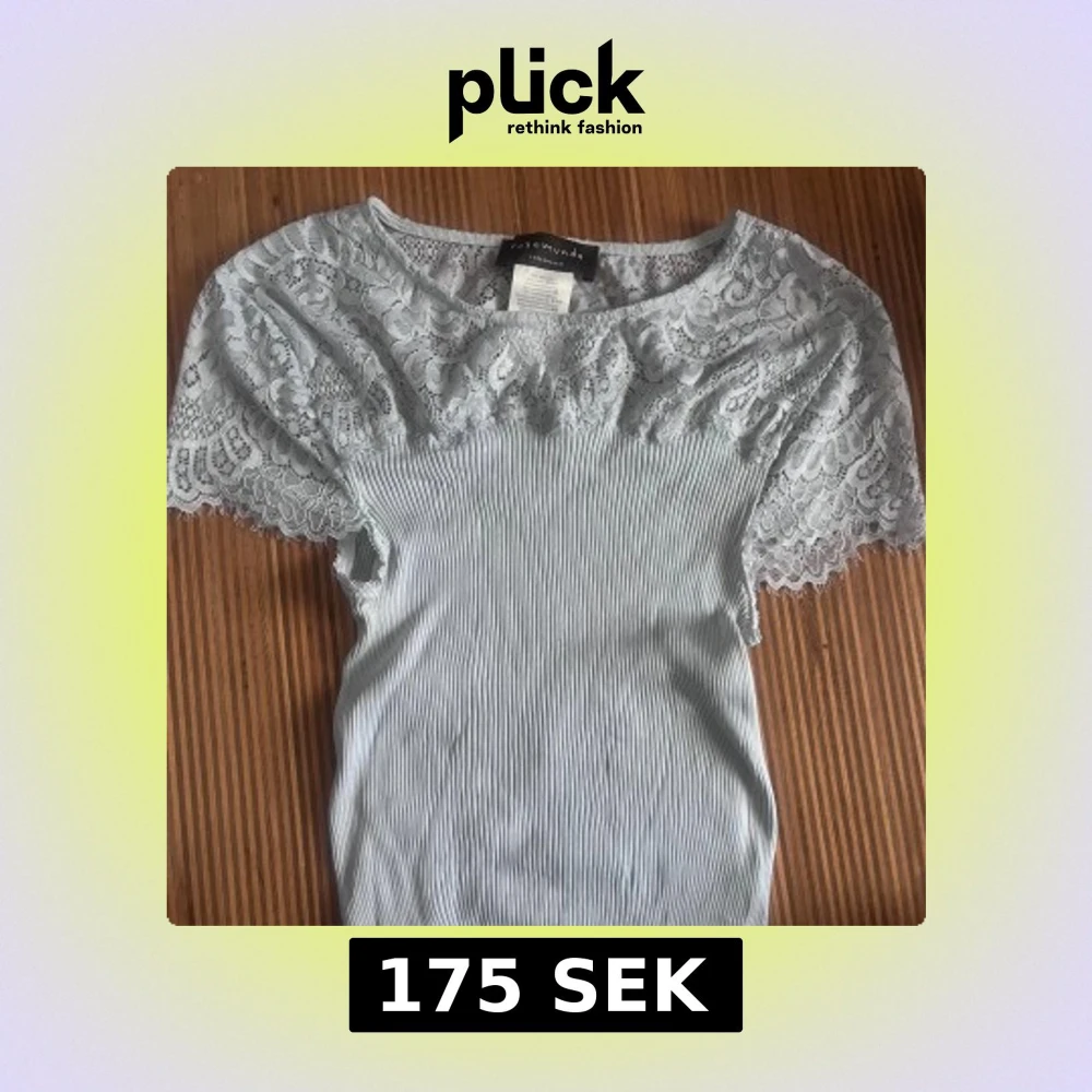 Supersöt ljusblå blus från Rosemunde med ribbad kropp och fina spetsärmar. Toppen är väldigt strechig och nypris är 750kr