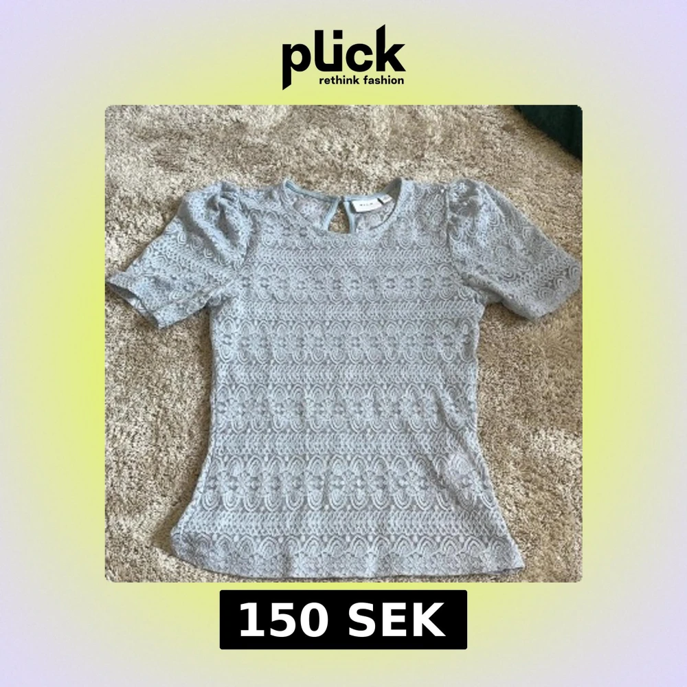 Superfin ljusblå blus från Vila med korta puffärmar och spetsmönster över hela toppen.