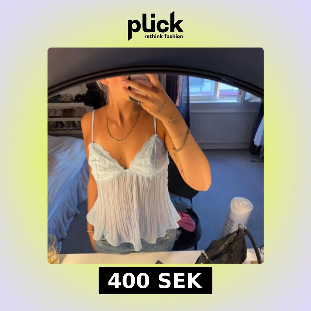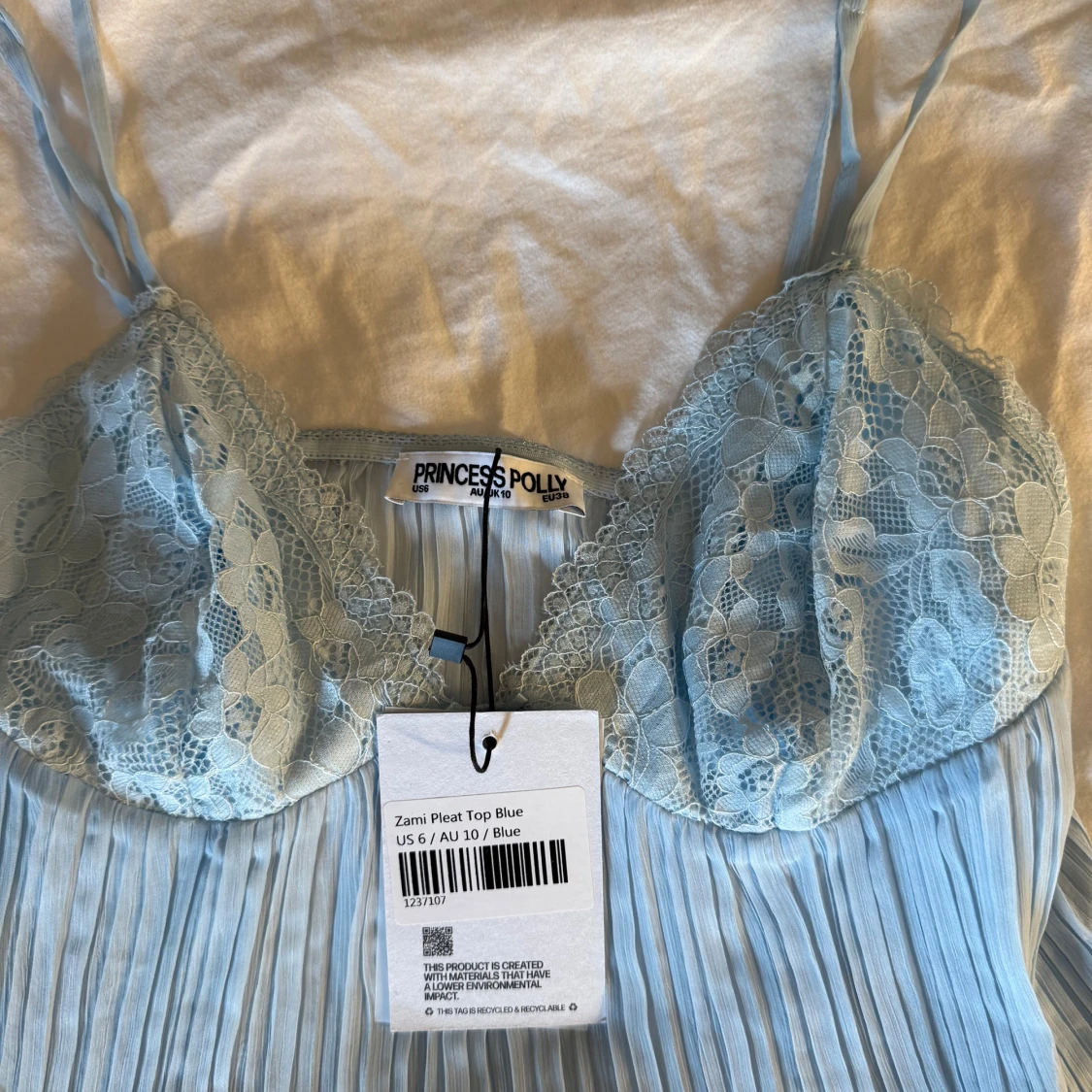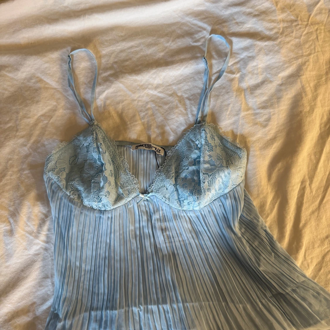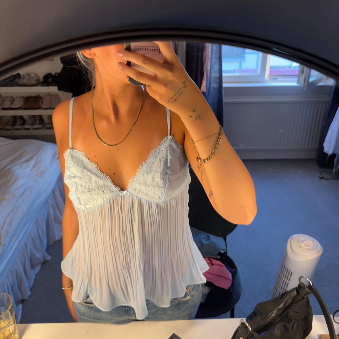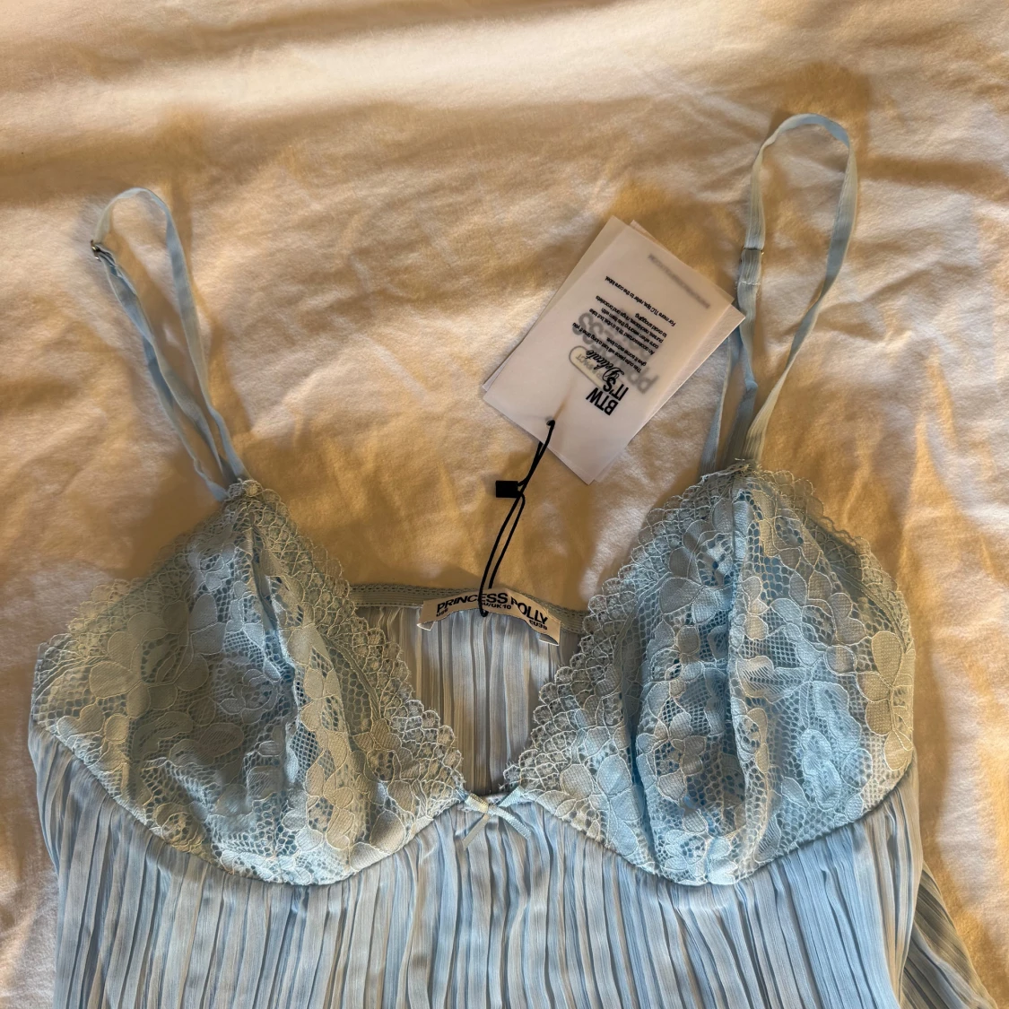 Superfin ljusblå linnetopp från Princess Polly med tunna axelband och spetsdetaljer över bysten. Aldrig använt! Toppen har plisserad, flowy nederdel och v-ringning. Perfekt för dig som gillar romantisk och söt stil!