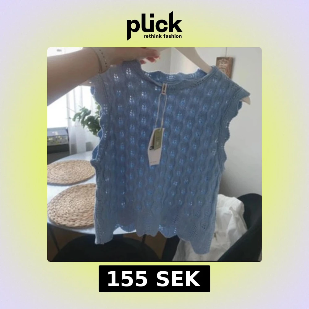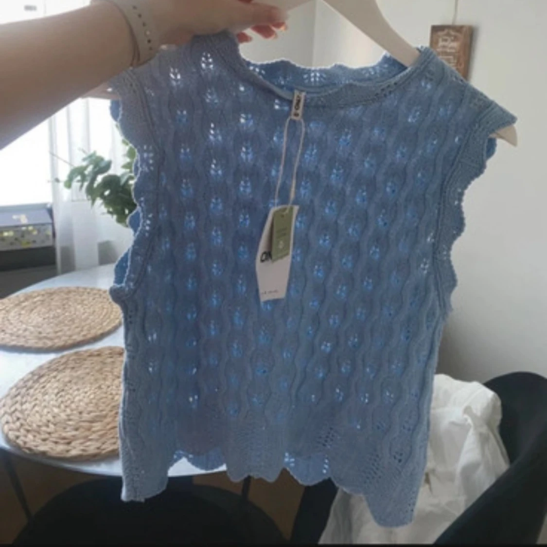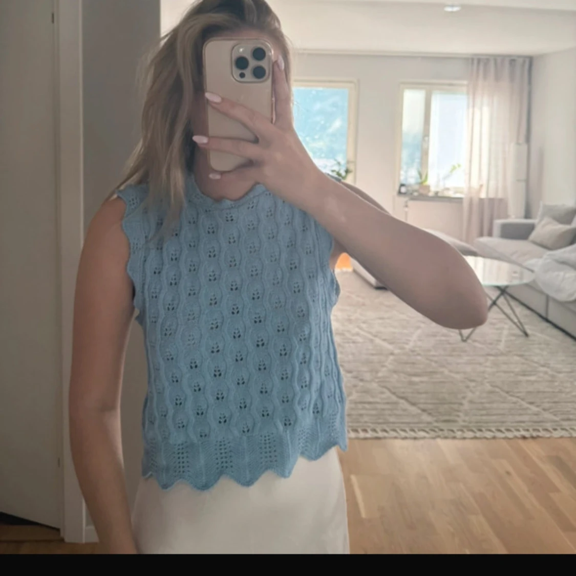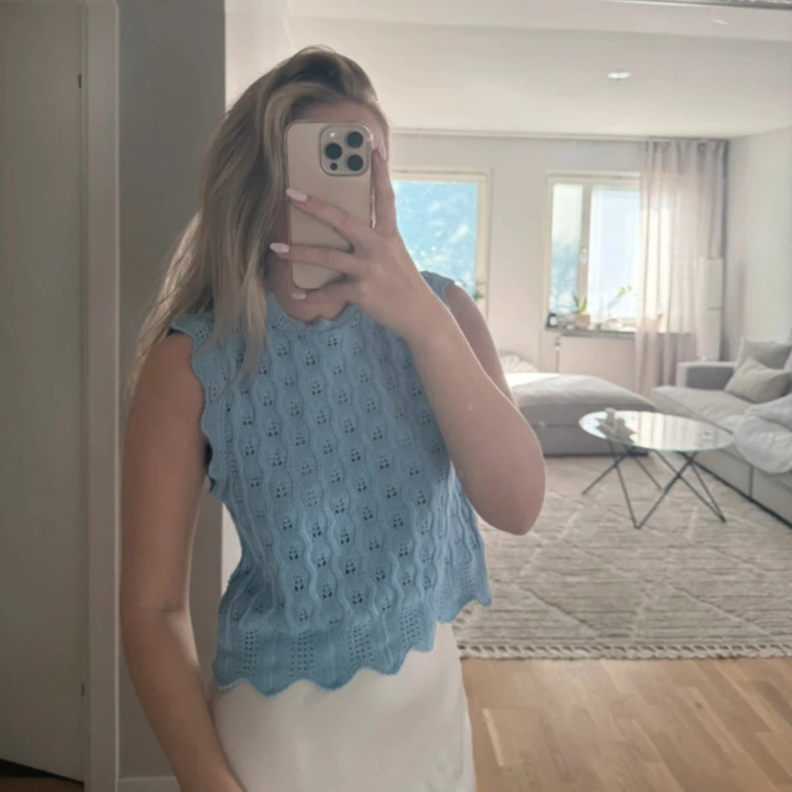 Supersöt ljusblå stickad topp från Only med vågig kant nertill och ärmlös design. Toppen har ett hålmönster över hela och rund halsringning. Ny med lapp 🌸