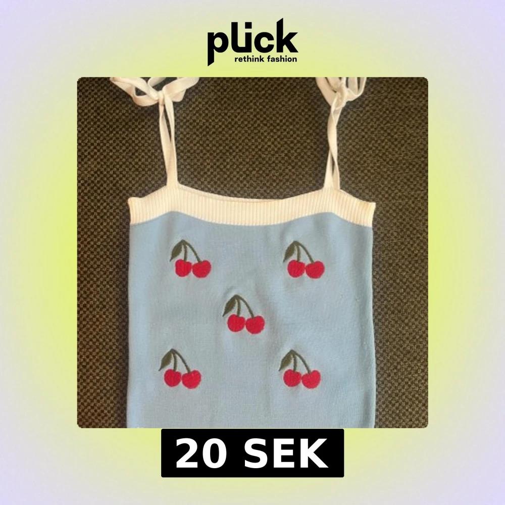 Supersöt ljusblå stickad linnetopp med vita ribbade kanter och knytbara axelband. Toppen har broderade röda körsbärsmotiv över hela framsidan. Perfekt för en somrig look och passar till både jeans och kjol.