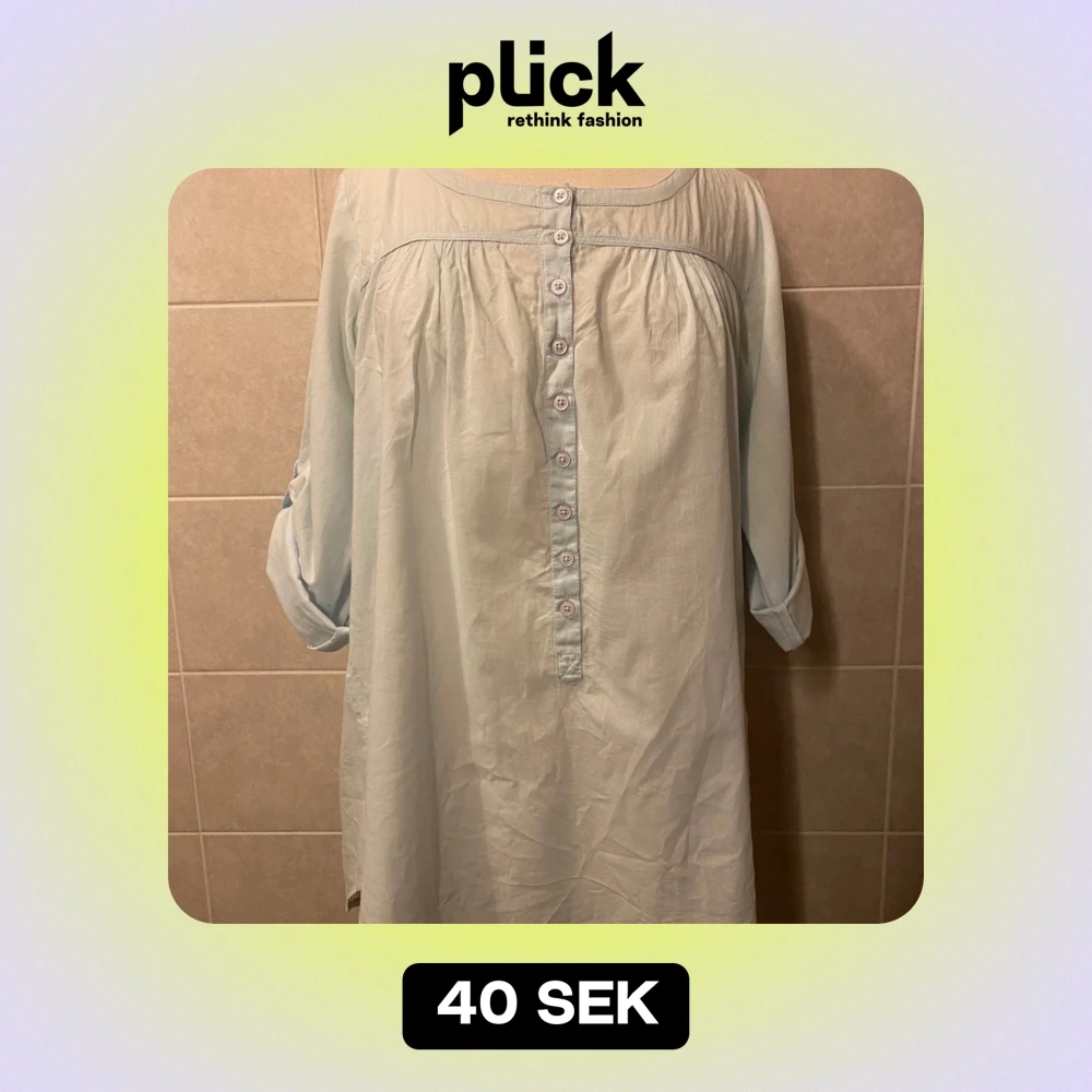 Säljer en ljusblå tunika från Gina Tricot i 100% bomull. Den har knappar framtill och trekvartsärmar som kan rullas upp. Perfekt för en avslappnad vår- eller sommardag. Skön och luftig passform!