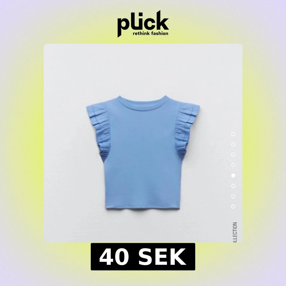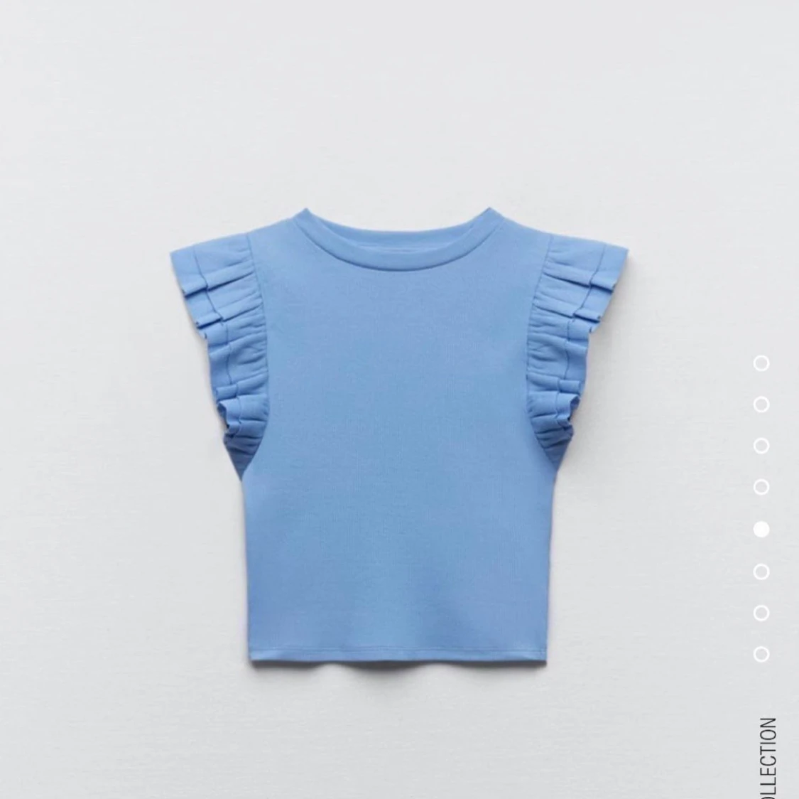 Supersöt ljusblå topp med volangdetaljer vid axlarna och ärmlös design. Croppad passform som ger en trendig look.