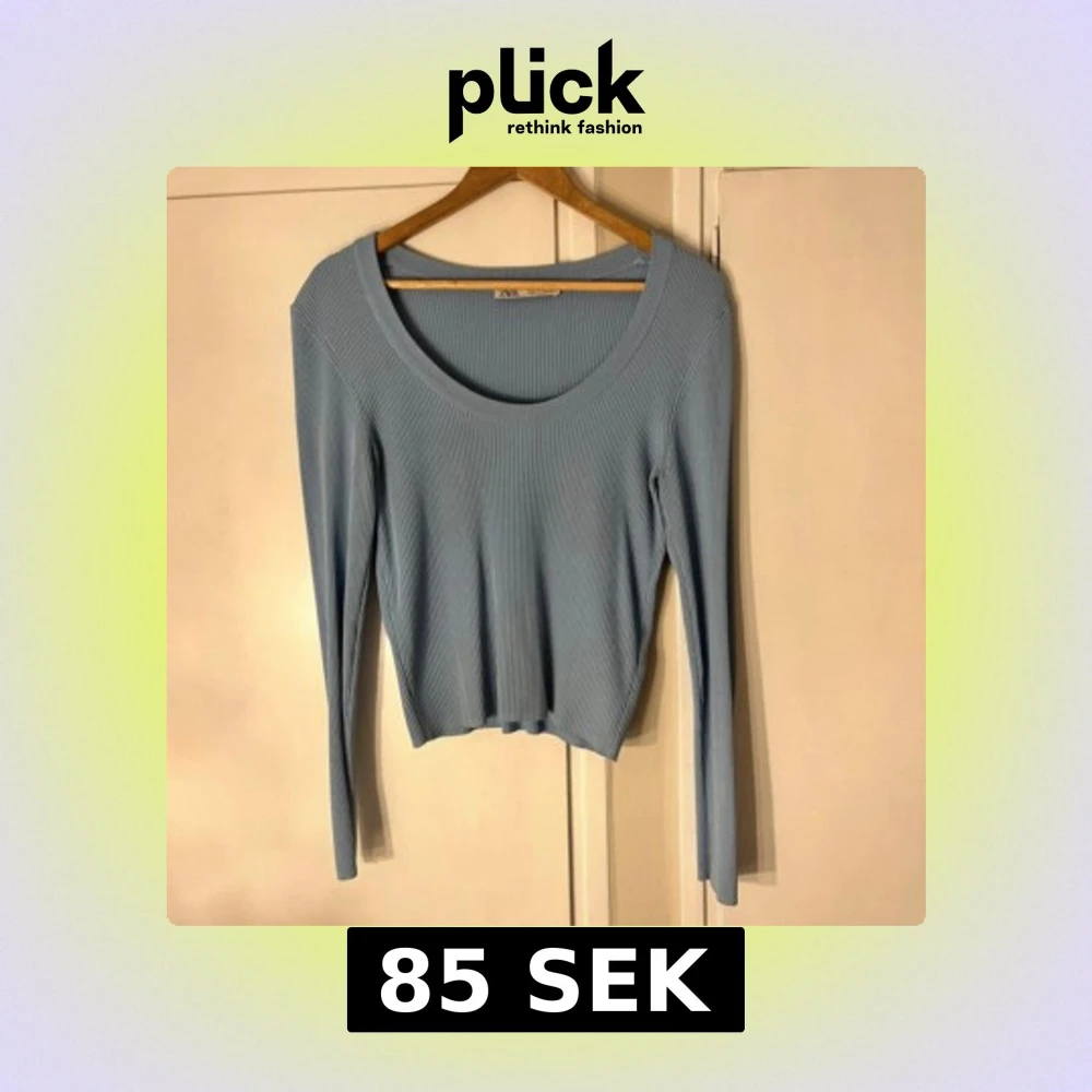 Säljer en ljusblå långärmad topp från Zara med ribbad struktur och rundad halsringning. Modellen är croppad och har en slim passform som sitter snyggt på kroppen. Perfekt att styla med jeans eller kjol för en fräsch look.
