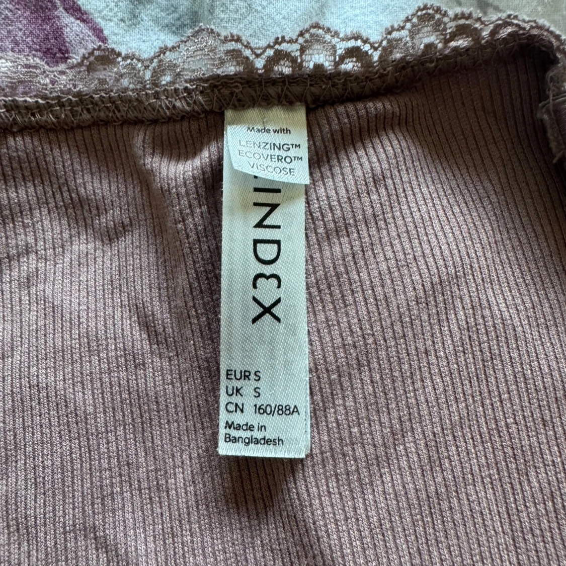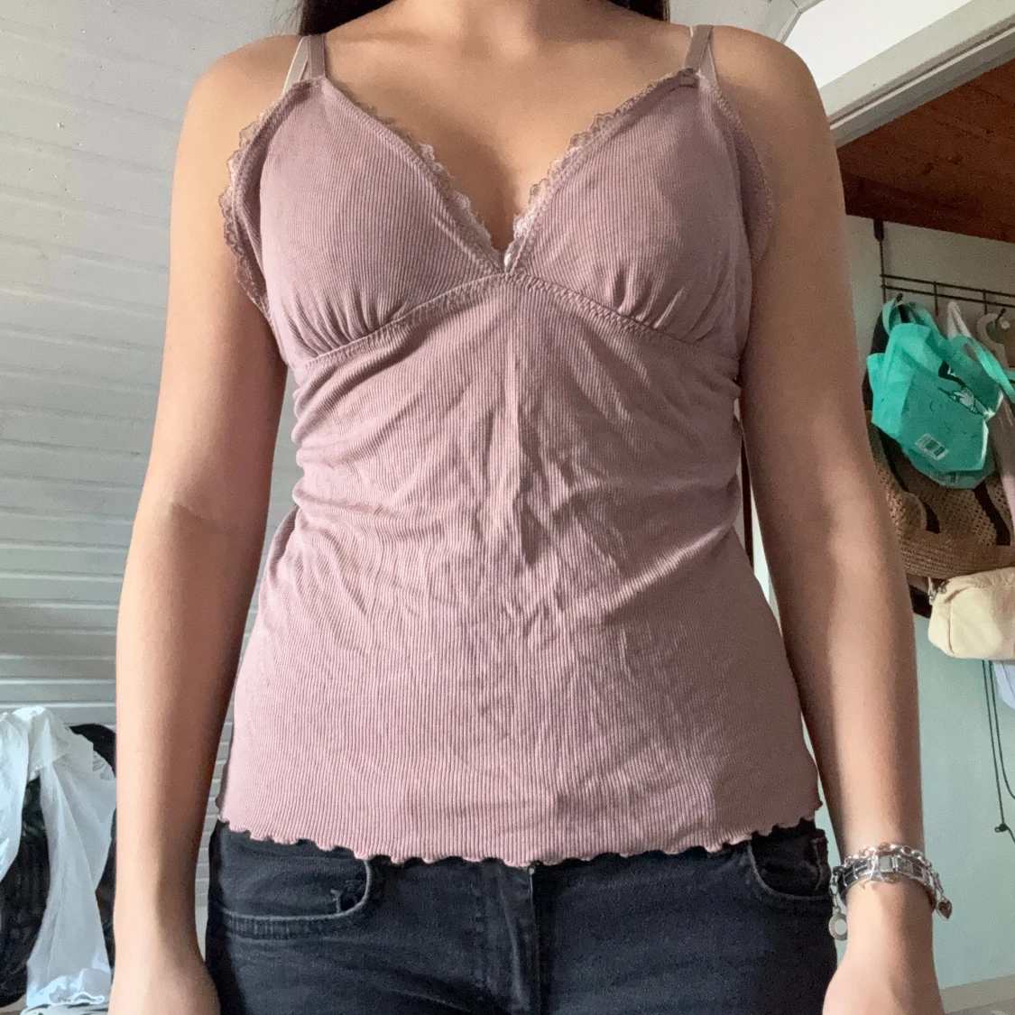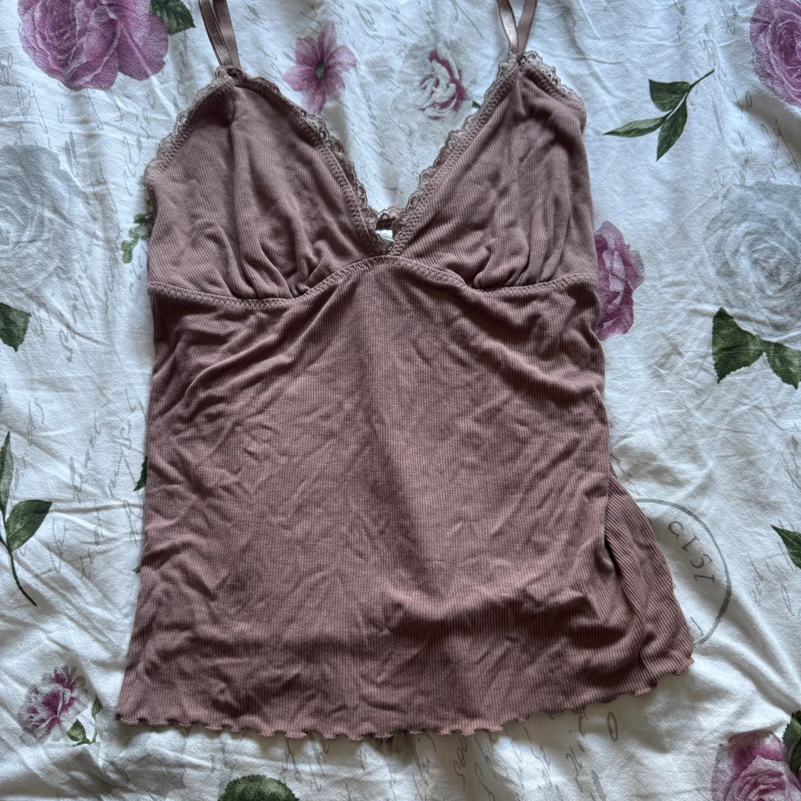 Supersöt ljusbrun ribbad linnetopp från Index med spetsdetaljer längs v-ringningen och tunna axelband. Toppen har vågig kant nertill och är tillverkad i mjuk viskosblandning. Perfekt för lager-på-lager eller sommarens varma dagar.