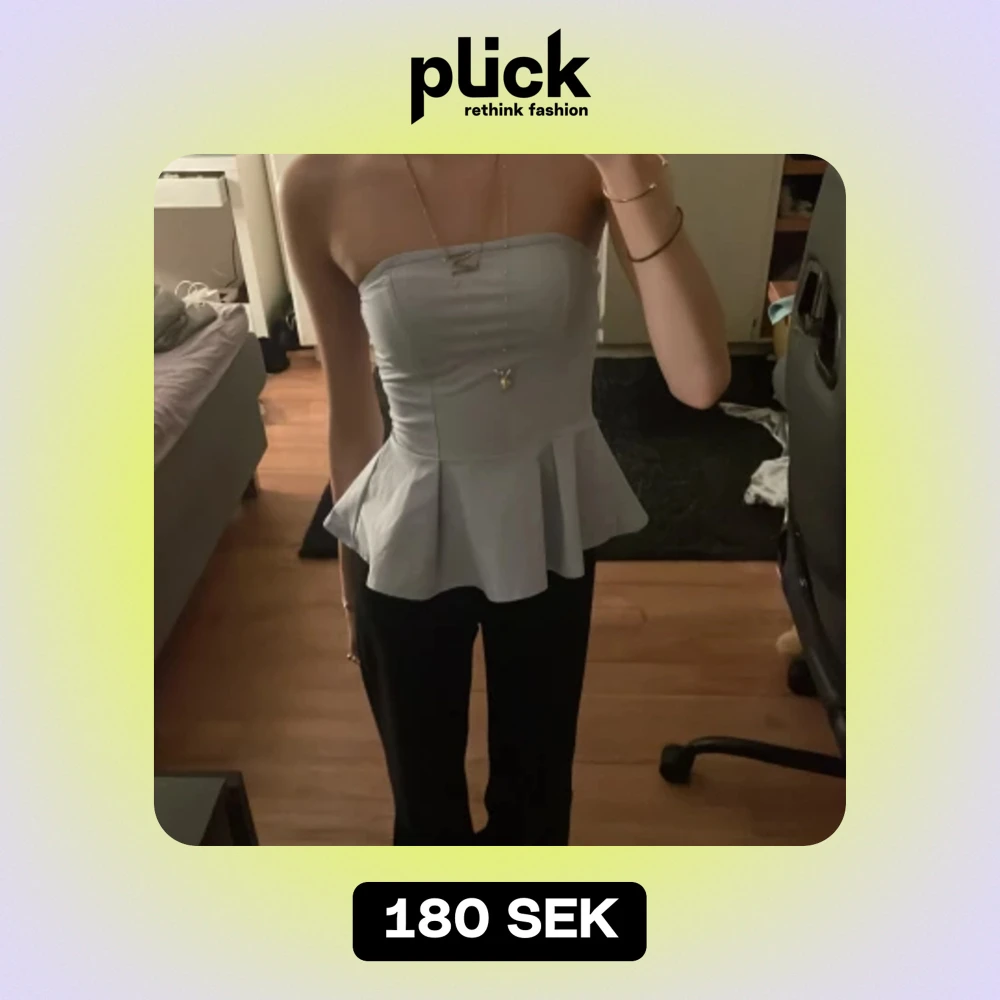 Säljer en superfin ljusblå axelbandslös topp från H&M i storlek XS. Toppen har en peplum-design som ger en snygg och feminin siluett. Perfekt för festliga tillfällen eller en utekväll. Toppen är i nyskick och har en tight passform💓