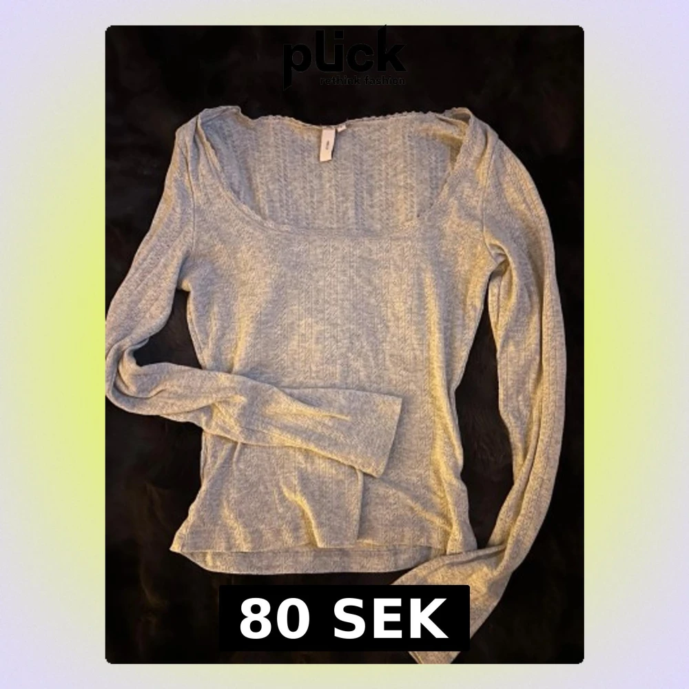 Säljer en ljusgrå långärmad topp från Nelly med ribbad struktur och små hålmönster. Toppen har en bred, rundad halsringning med spetskant
