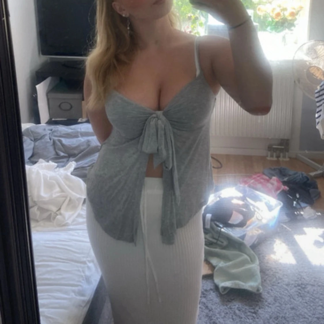 Supersöt ljusgrå linnetopp med smala axelband och knyt framtill. Toppen har en djup v-ringning och är tillverkad i ett mjukt, tunt material. Använd fåtal gånger