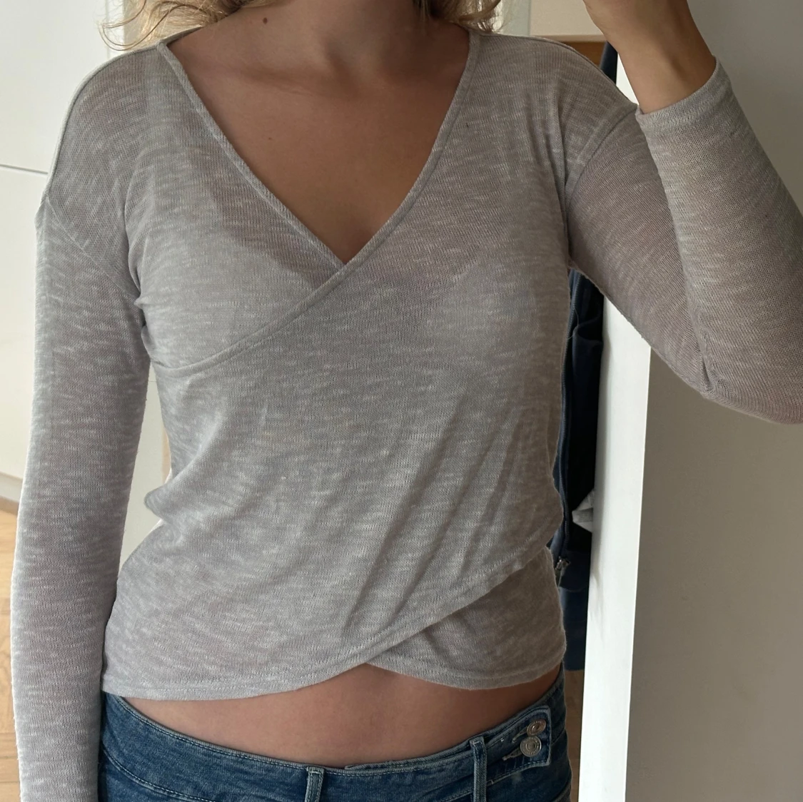 Supersnygg ljusgrå omlottopp med croppad passform och lång ärm. Tunt, mjukt material i bomull som känns luftigt och skönt. Djup v-ringning framtill och stilren look som passar perfekt till jeans eller kjol. Jag har stylat den med linne under