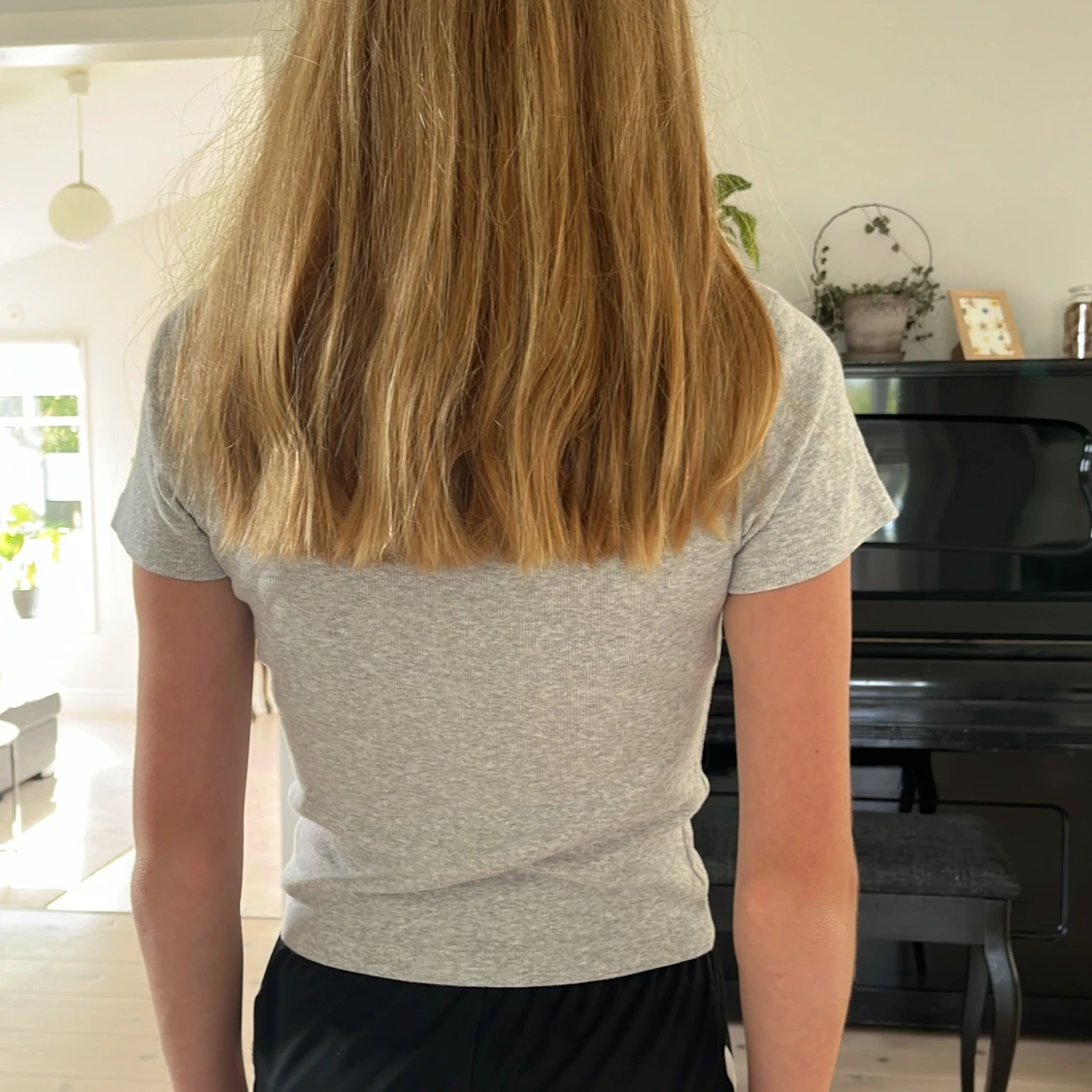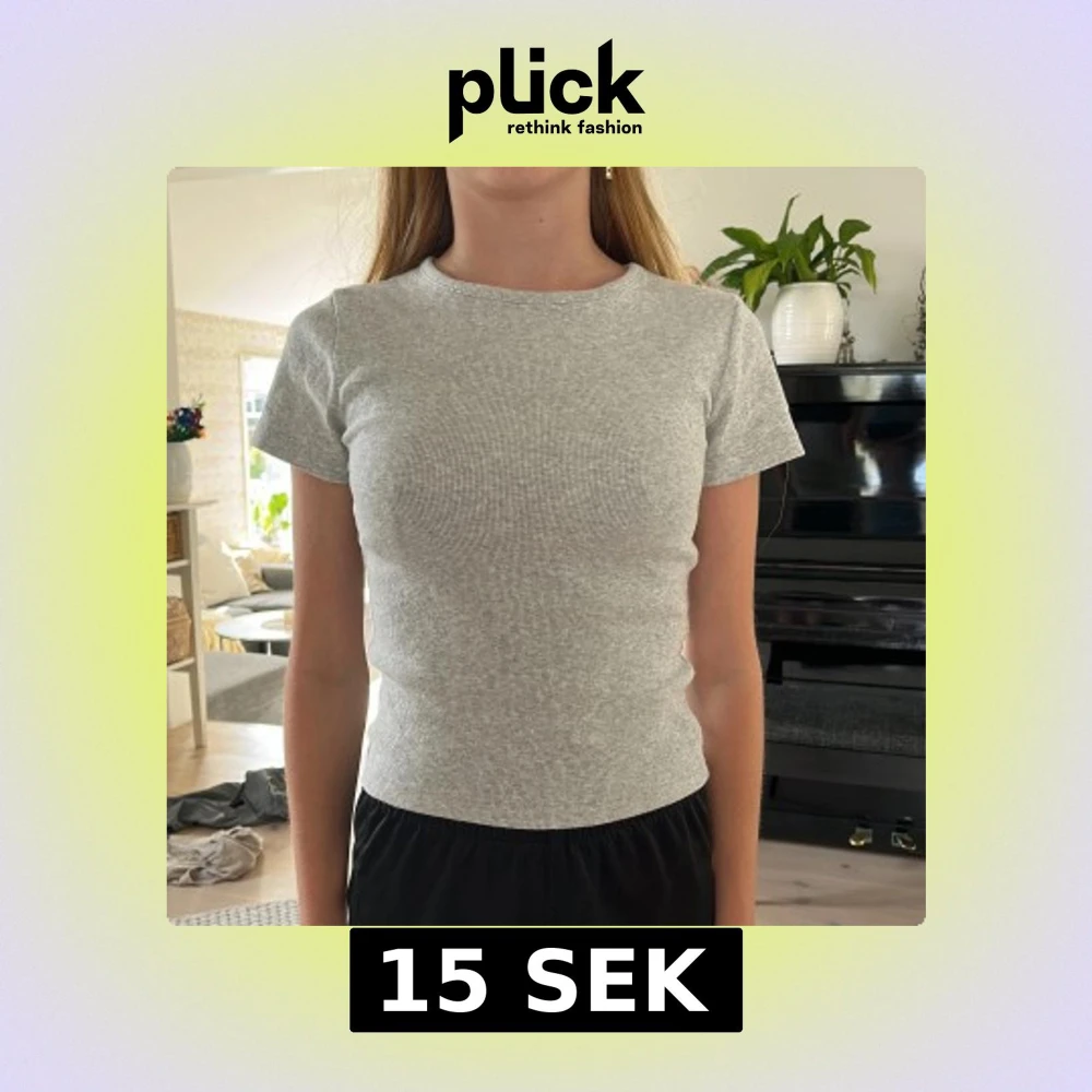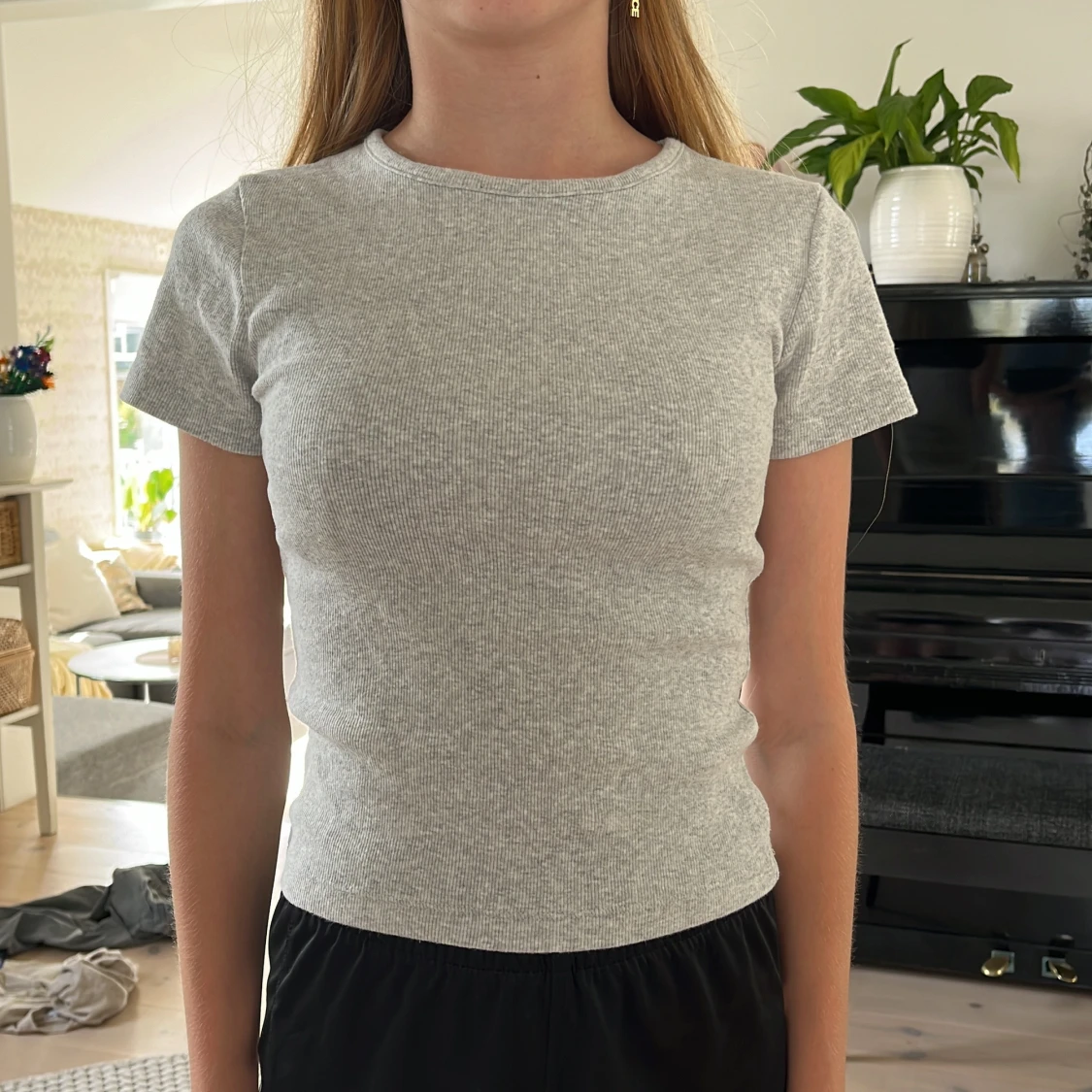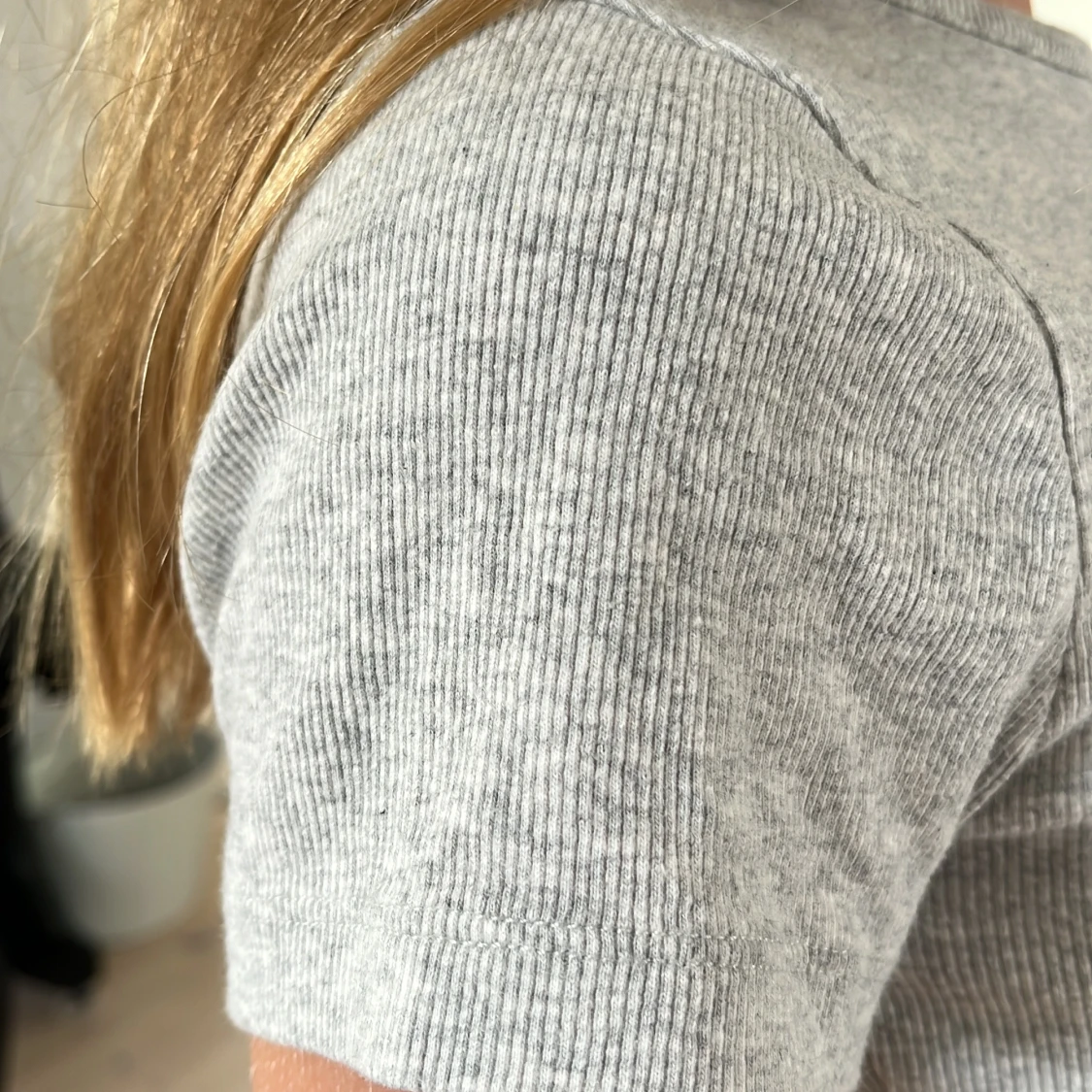 En basic ljusgrå ribbad t-shirt med rund hals och korta ärmar. Toppen har en slim passform och är tillverkad i mjuk bomullsmix som sitter skönt mot kroppen. Perfekt att matcha med jeans eller shorts för en clean look.