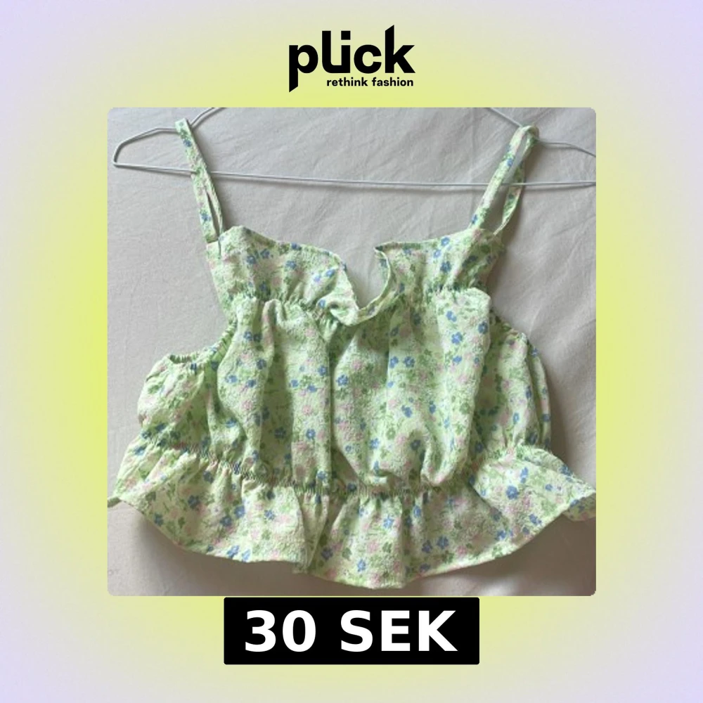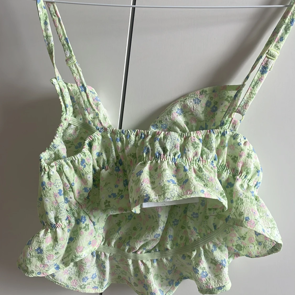 Superfin ljusgrön croppad linnetopp med blommigt mönster i blått och rosa. Toppen har smala axelband och volangdetaljer nedtill. Perfekt för varma dagar och ger en söt och somrig look.