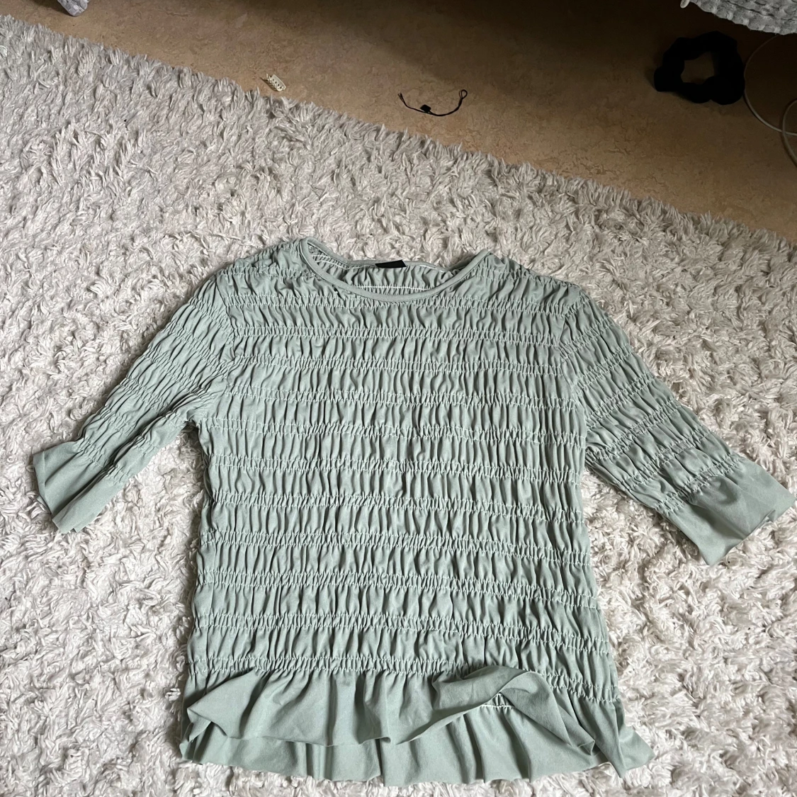 Supersöt ljusgrön blus med smock över hela plagget och volangdetalj längst ner. Blusen har rund halsringning och trekvartsärm med lätt puff. Perfekt för dig som gillar en feminin och trendig look.