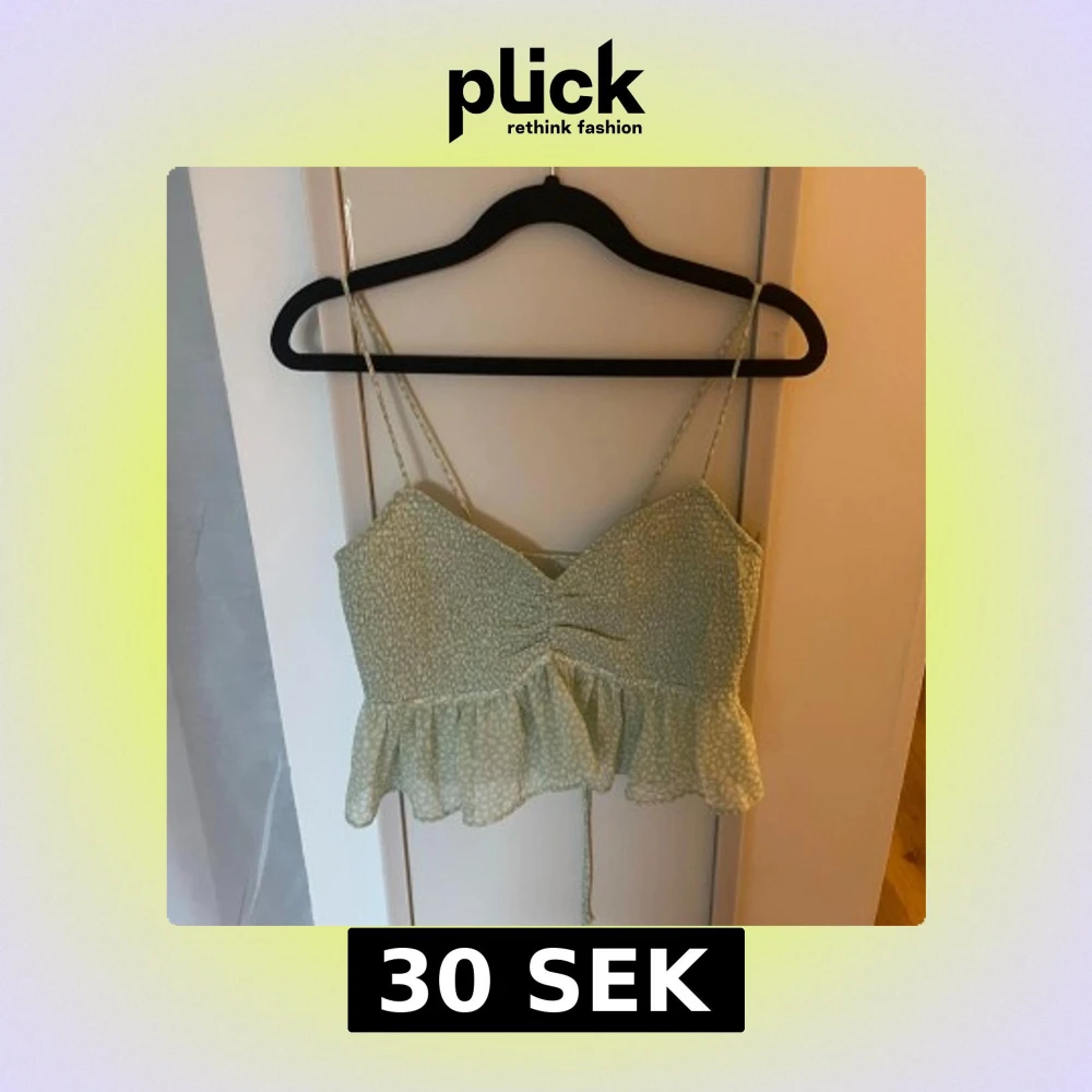 Superfin ljusgrön croppad linnetopp med smala axelband och volang nertill. Toppen har ett diskret mönster, rynkdetalj framtill och knytning i ryggen. Perfekt för varma dagar och ger en söt och somrig vibe.