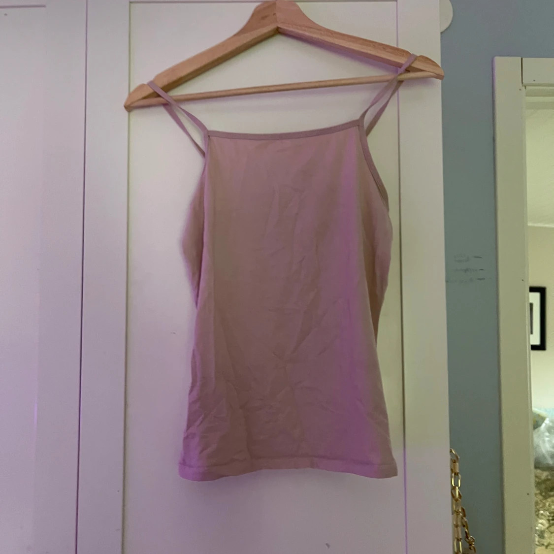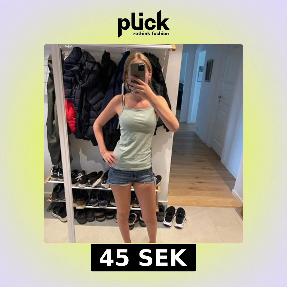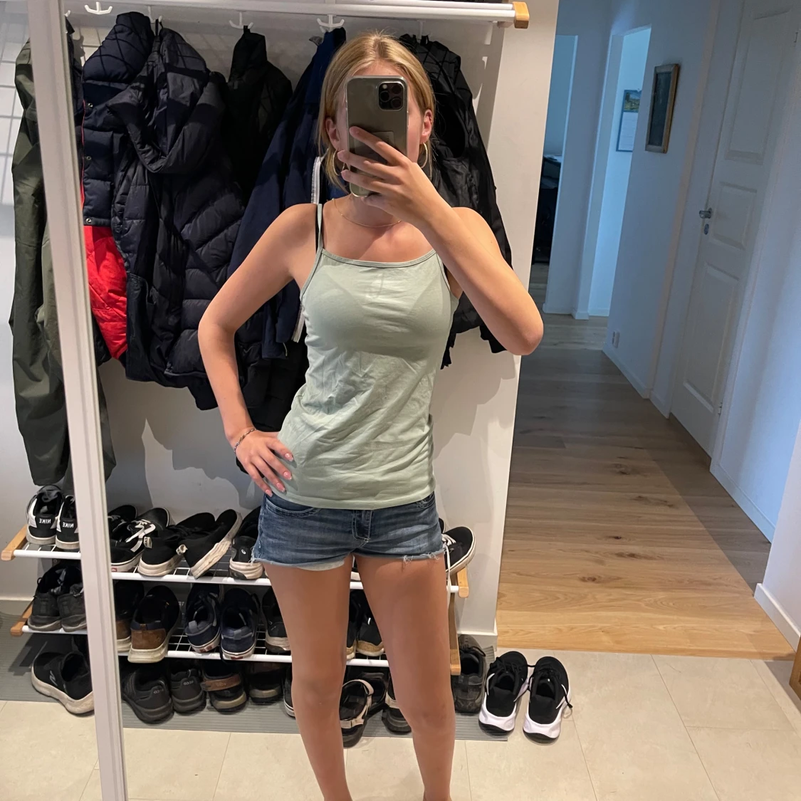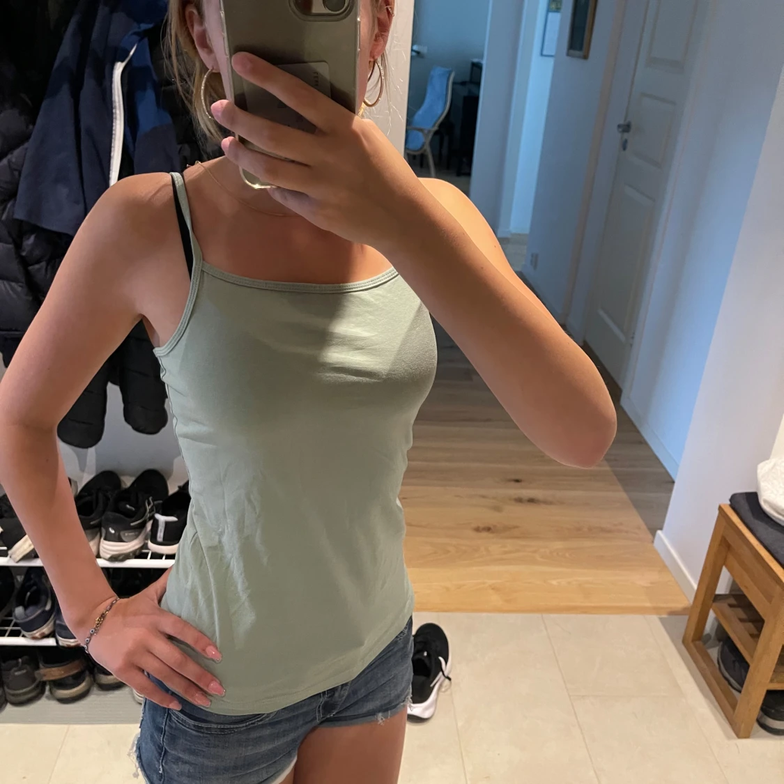 Säljer en ljusgrön linnetopp från H&M med smala axelband. Toppen är i mjuk bomull och passar perfekt till sommaren. Finns också i rosa💕