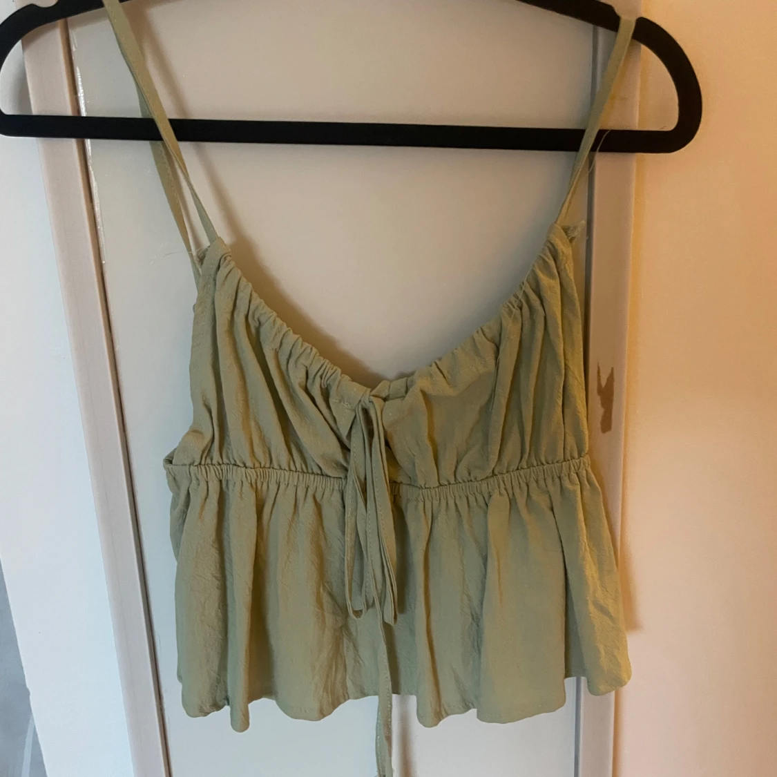 Supersöt ljusgrön linnetopp med smala axelband och knyt framtill. Toppen har en luftig och flowy passform med rynkade detaljer och v-ringning. Perfekt för varma dagar och enkel att styla till jeans eller kjol.