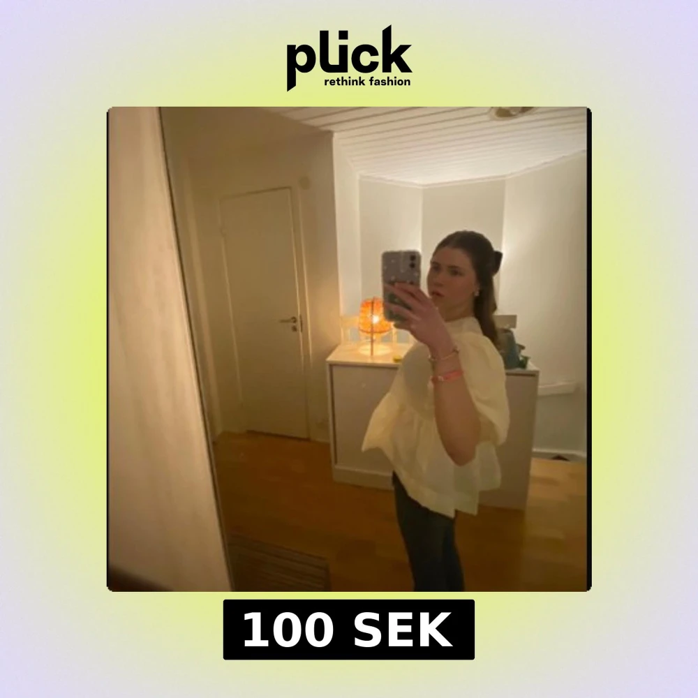 Supersöt ljusgul blus från Gina Tricot med puffiga korta ärmar och volang nedtill. Blusen har en lätt strukturerad yta och rund halsringning. Perfekt för dig som gillar en romantisk och trendig stil.