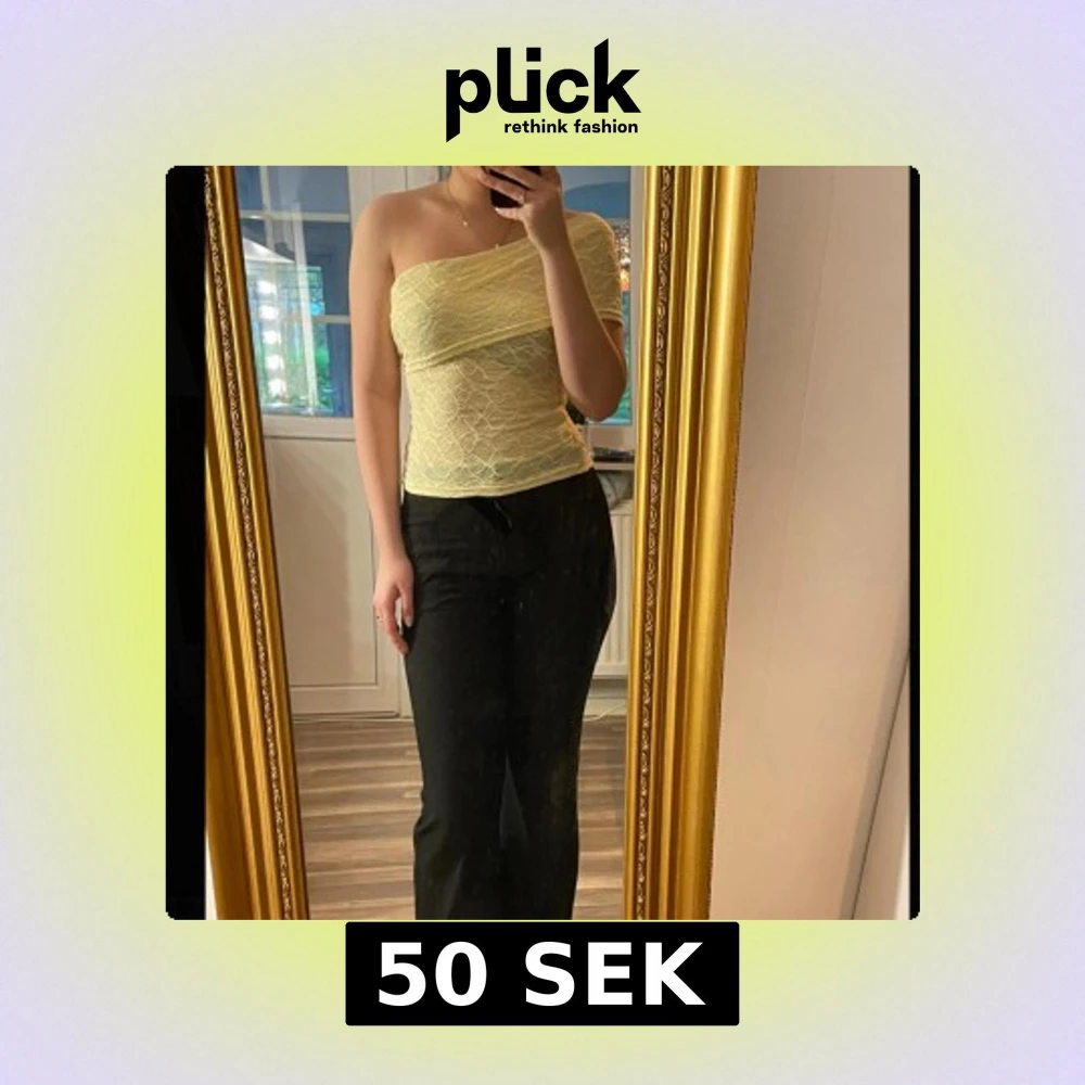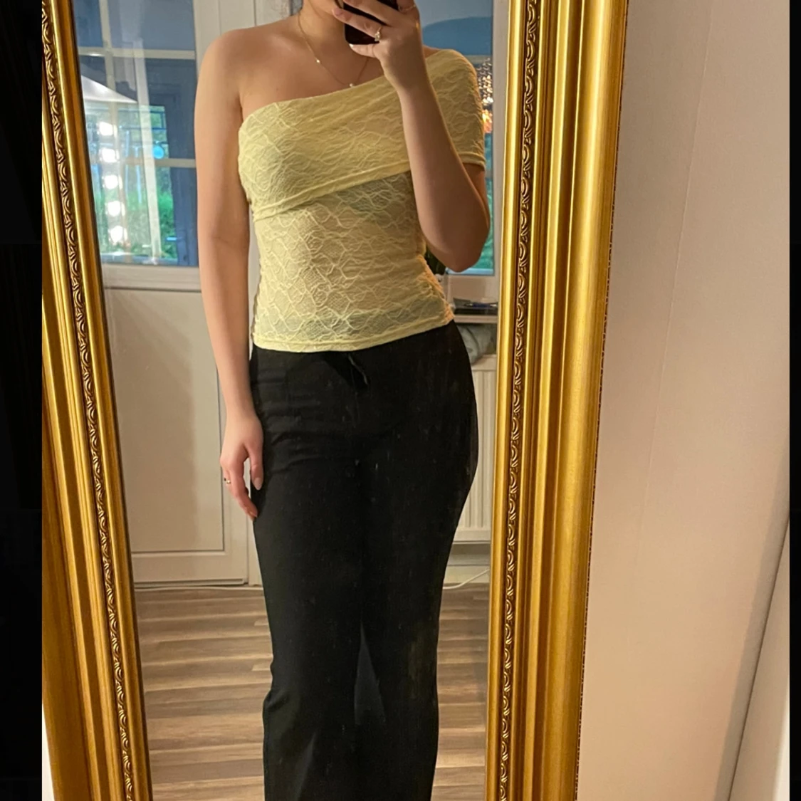 Säljer en ljusgul tubtopp med spets och oneshoulder-design. Aldrig använd!