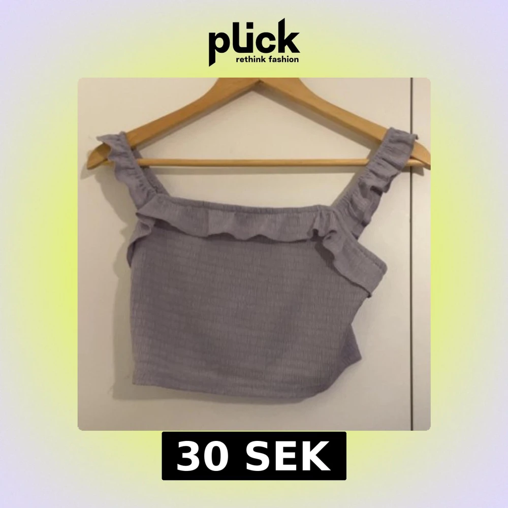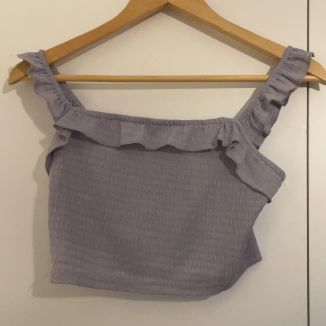 Superfin ljuslila croppad linnetopp med volangdetalj längs axelbanden och över bysten. Toppen har en smockad struktur och breda axelband med rynk. Perfekt för varma dagar och en söt touch till din outfit.