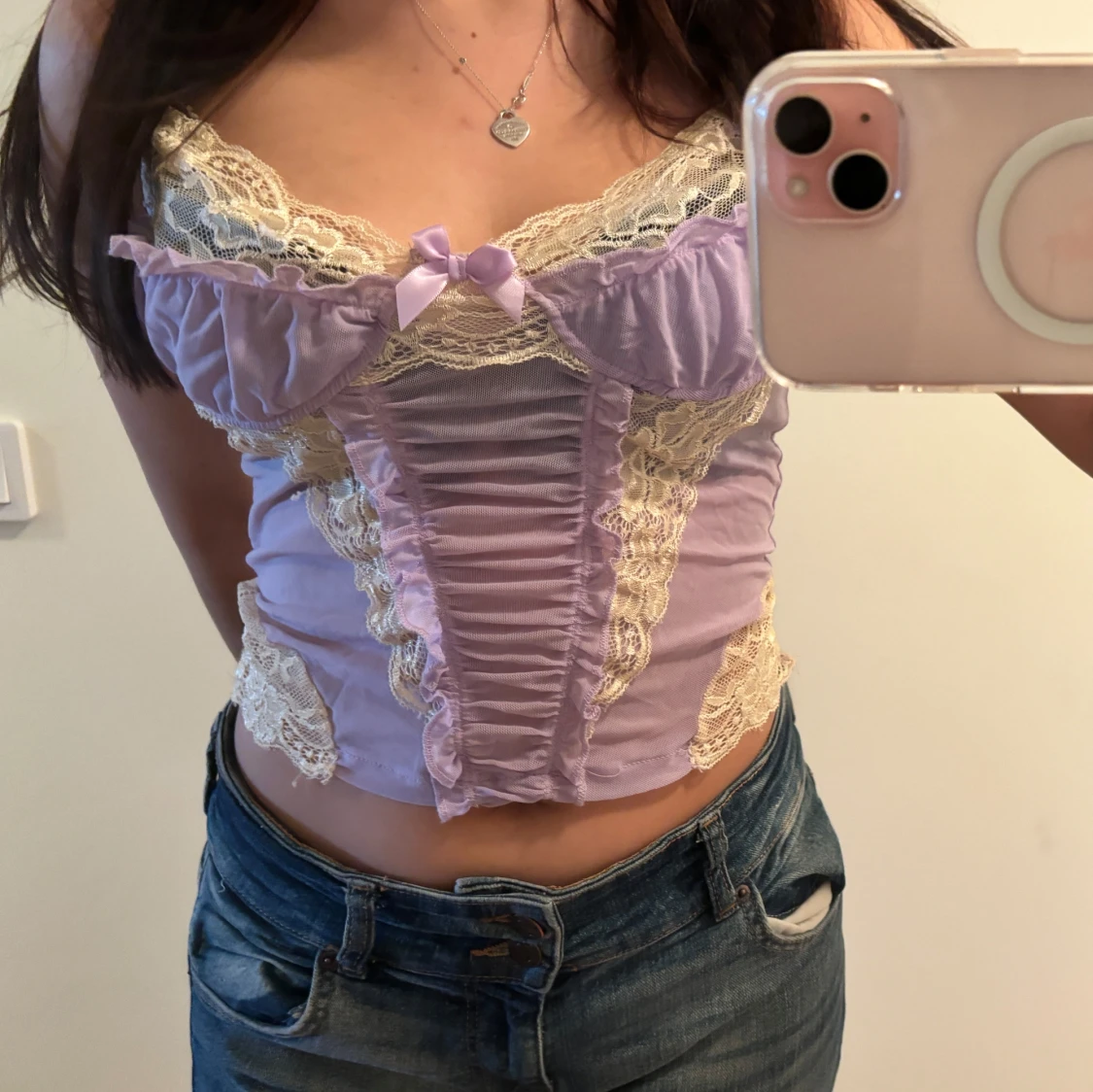 Superfin ljuslila korsett med krämvit spets och rosett framtill. Toppen har en romantisk känsla med volang och dekorativa sömmar. Perfekt att styla med jeans eller kjol för en trendig look.