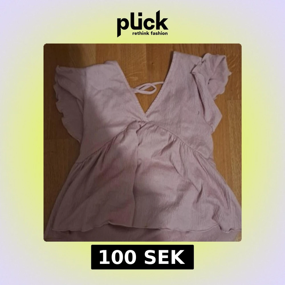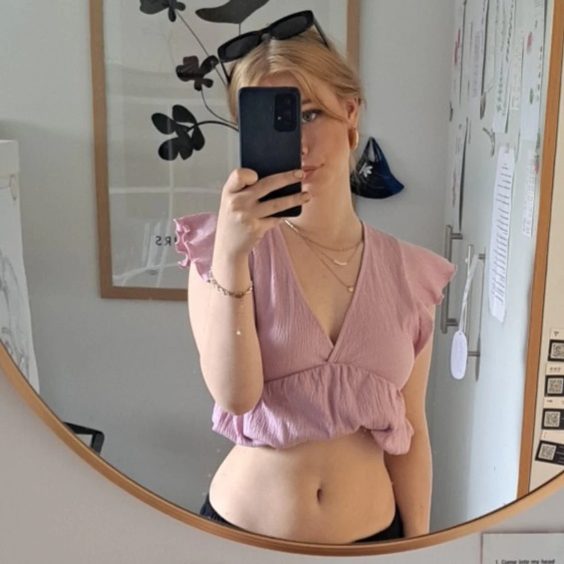 Supersöt ljuslila/rosa blus med omlott och v-ringning. Toppen har korta volangärmar och croppad passform, samt knyt i ryggen. Perfekt för vår och sommar när du vill ha en chill men ändå söt look.