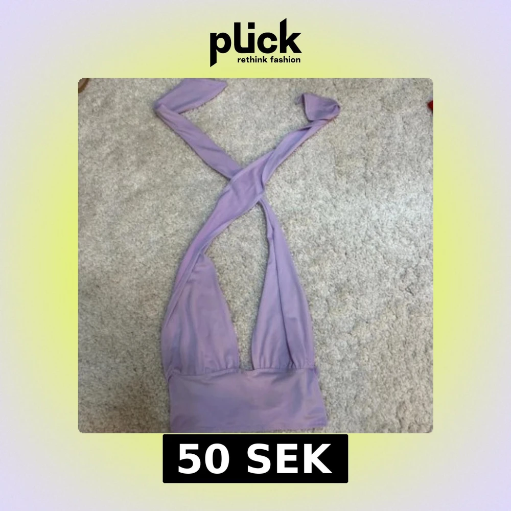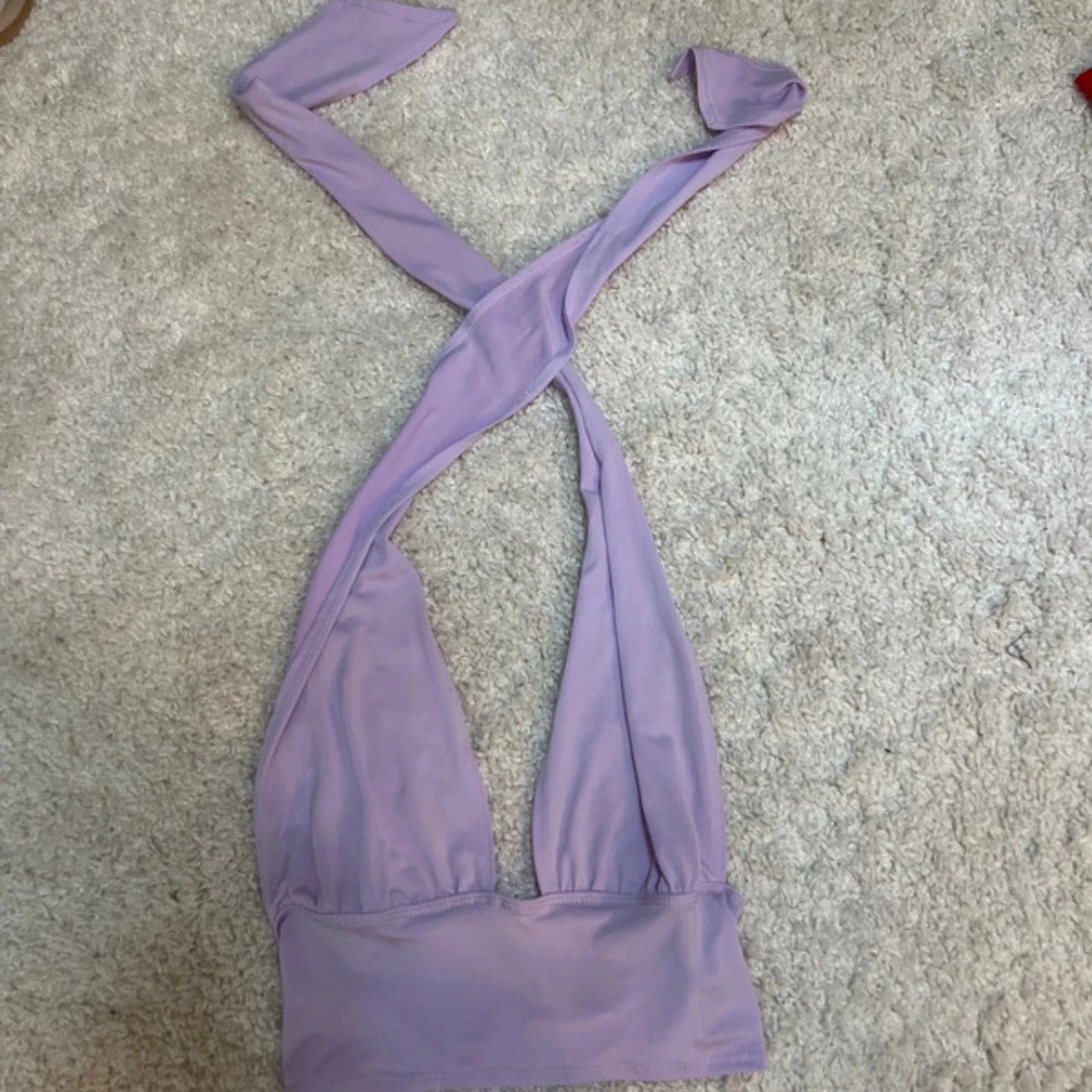 Säljer en ljuslila topp med breda axelband som kan knytas i nacken.