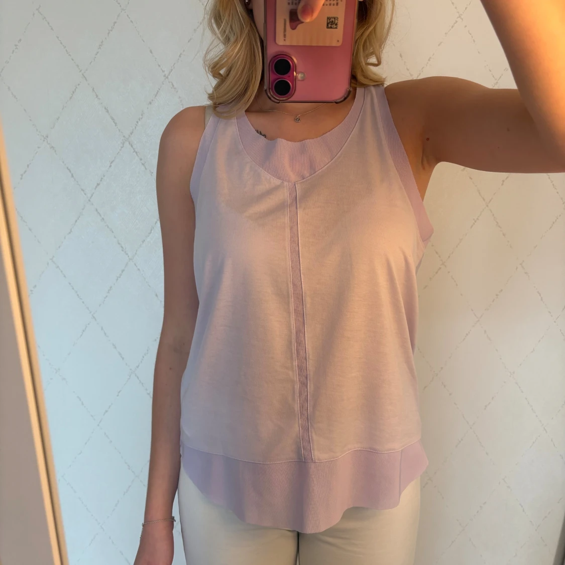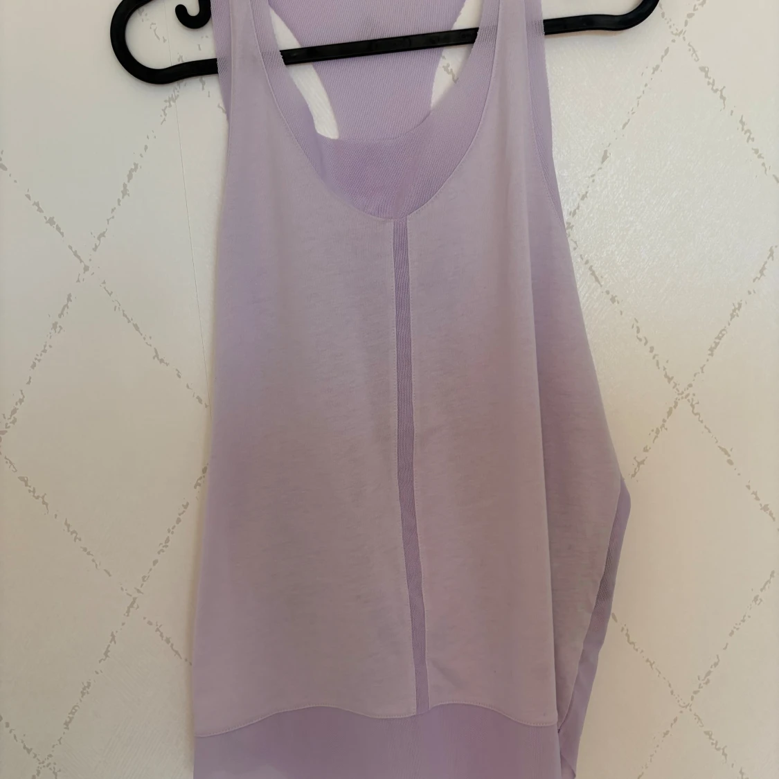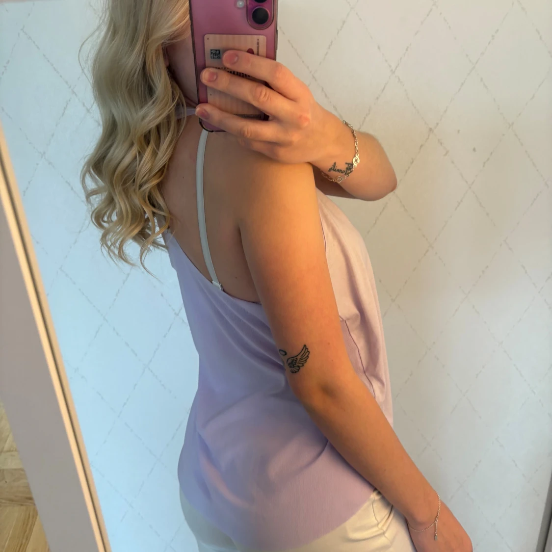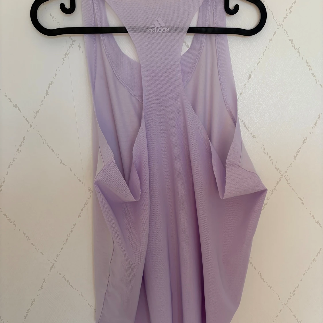 Säljer en ljuslila träningslinne från Adidas med brottarrygg och diskret logga i nacken. Toppen är ärmlös och har en lös passform, perfekt för träning eller varma dagar. Tillverkad i ett lätt och svalt syntetmaterial som andas.