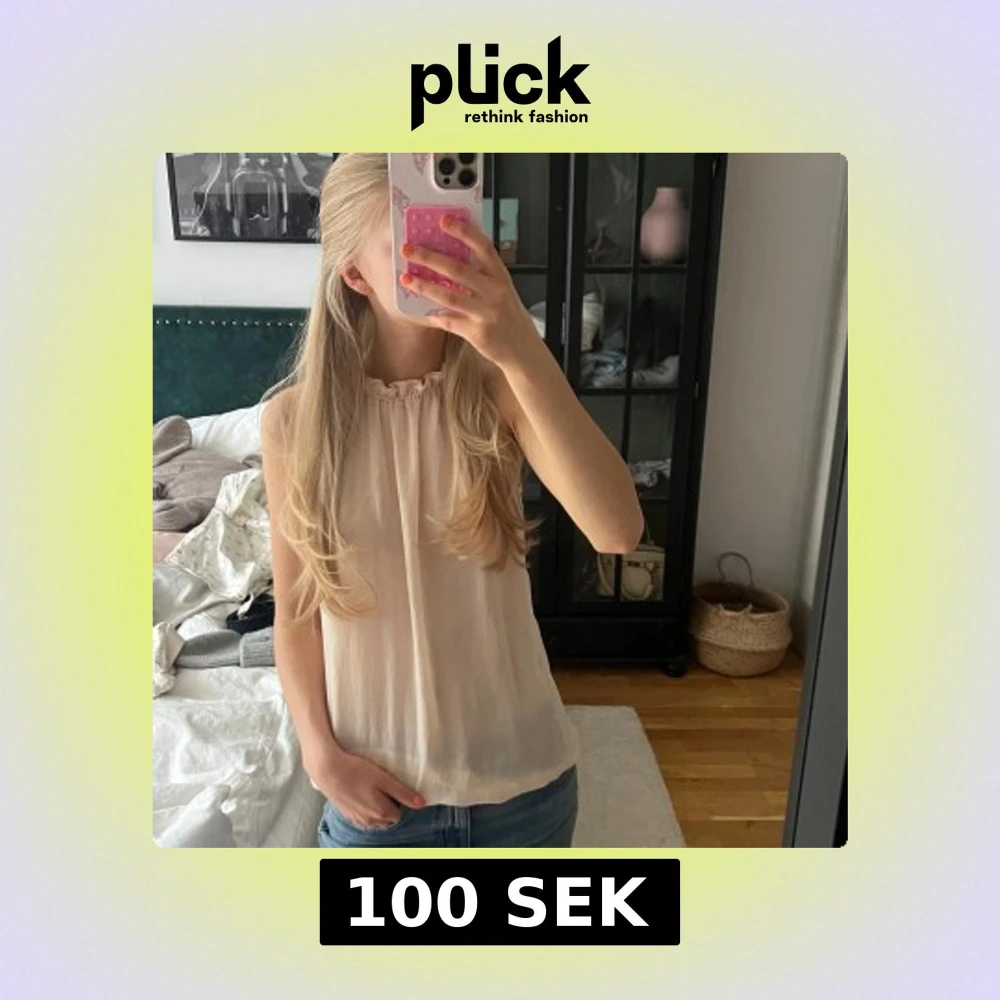 Säljer en söt ljusrosa/beige blus med rynkad halsringning och ärmlös design. Toppen har en lös passform och är tillverkad i ett tunt, lätt material. Det sitter en guldkedja i halsen så att toppen knäpps som ett halsband❣️